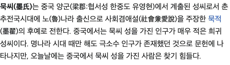 - 묵씨는 고대 중국에서 유래한 희귀성씨는 맞지만 우리나라에 170여 가구가 존재(1985년 인구조사 결과)