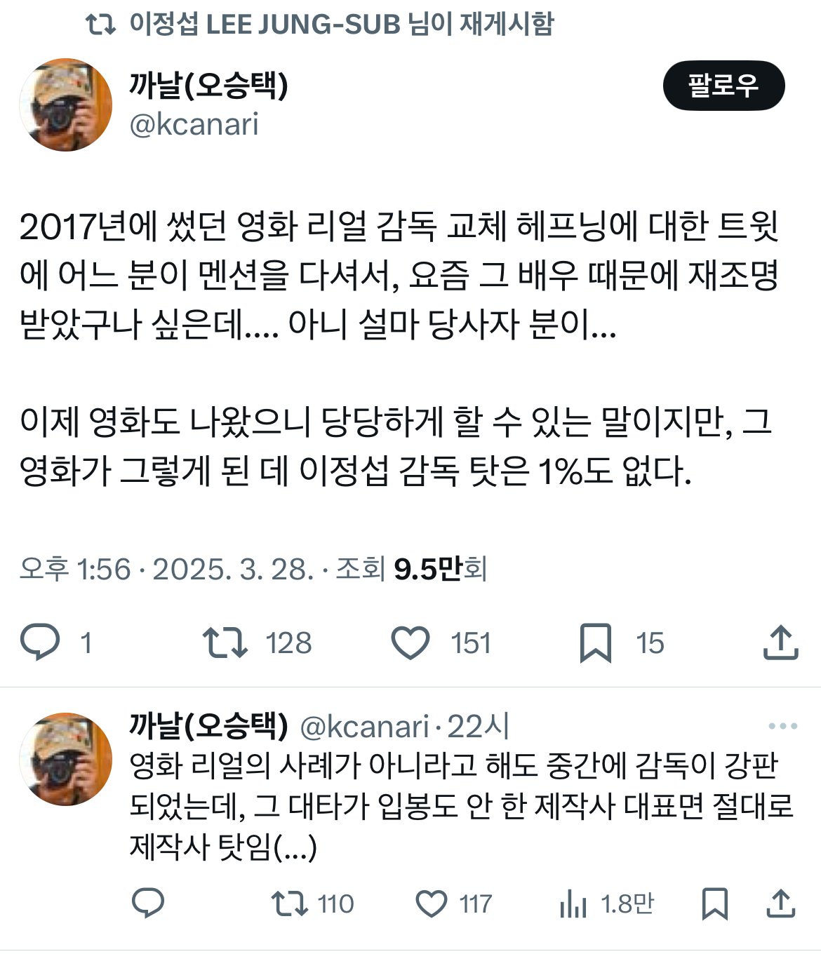 작성시간 25.03.29 각본이 개노답이라 감독이 중도하차한게 아니였음?