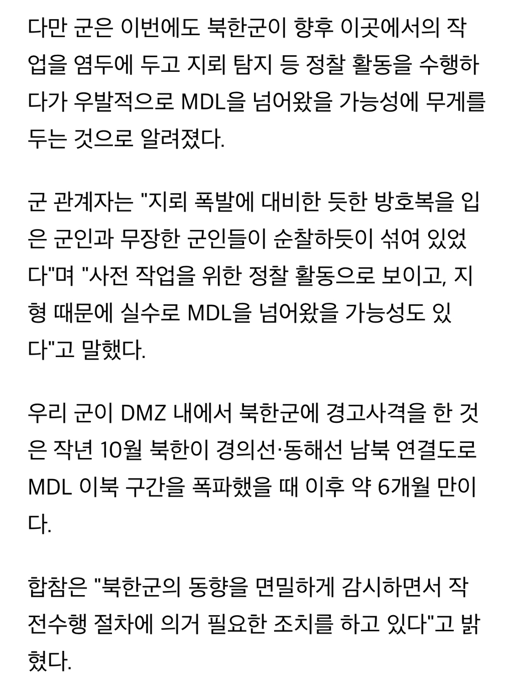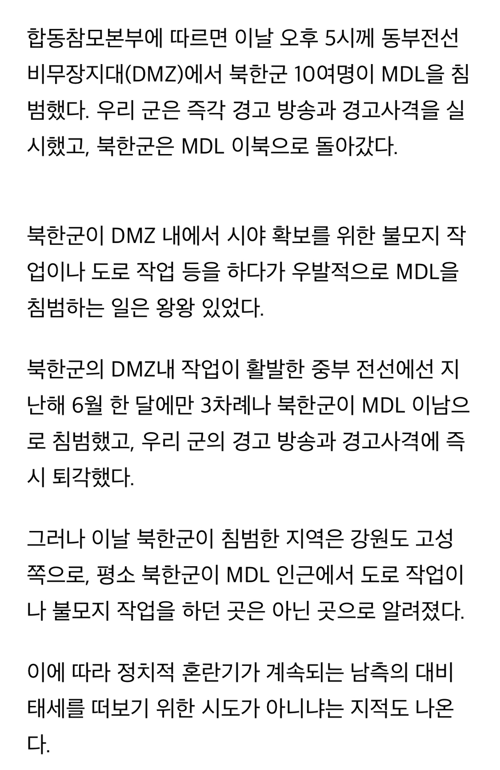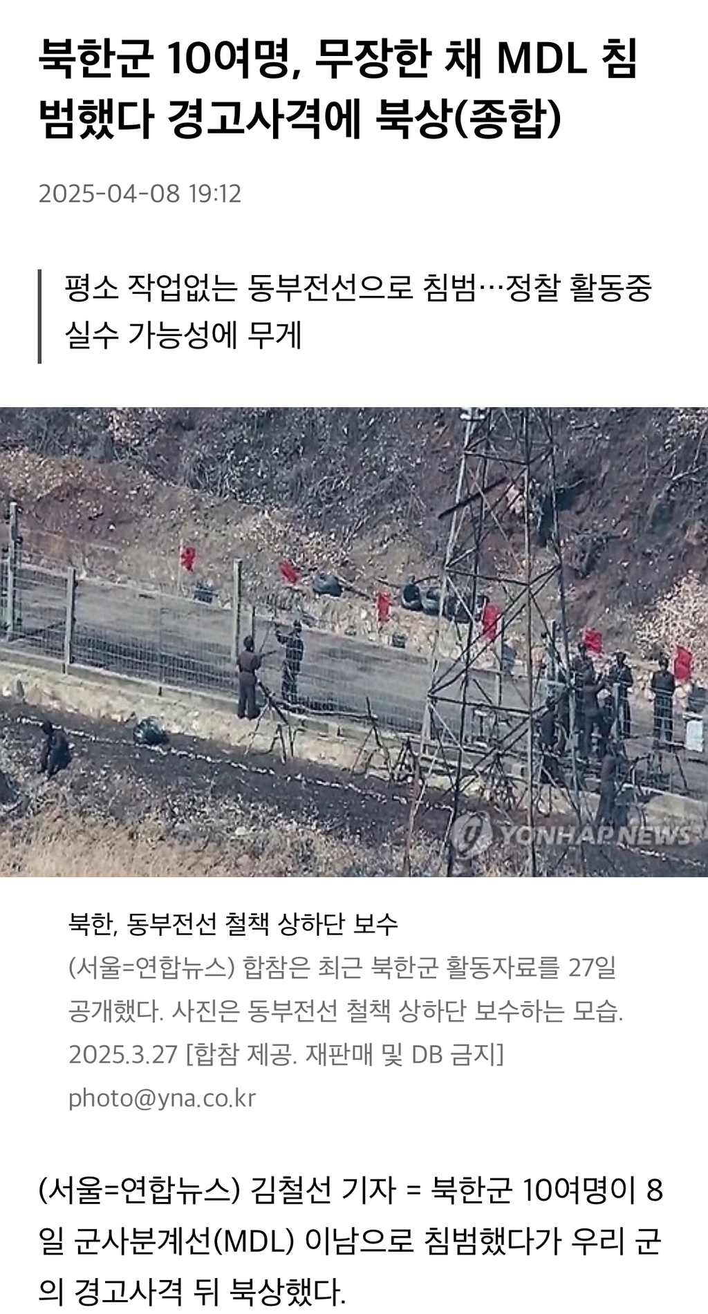 도탁스 (DOTAX) [[뉴스]]북한군 10여명, 무장한 채 MDL 침범… 경고사격에 북상 작성시간25.04.08|조회수16,816 목록 댓글 16 글자크기 작게가 글자크기 크게가 https://www.yna.co.kr/amp/view/AKR20250408158351504북한군 10여명, 무장한 채 MDL 침범했다 경고사격에 북상(종합) | 연합뉴스(서울=연합뉴스) 김철선 기자 = 북한군 10여명이 8일 군사분계선(MDL) 이남으로 침범했다가 우리 군의 경고사격 뒤 북상했다.www.yna.co.kr 다음검색 현재 게시글 추가 기능 열기 북마크 공유하기 신고 센터로 신고 댓글 16 댓글 리스트 작성시간 25.04.08 계엄정국때도 안 내려오던 놈들이 지금??? 작성시간 25.04.08 ㅈ밥인줄아나 디질려고 작성시간 25.04.08 경고사격말고 대가리 뚫엇어야됫는데 작성시간 25.04.08 항상 경계.. 믿을것들이 안돼지 작성시간 25.04.09 빈틈있나 시험해본듯 카페 방문해 더 많은 댓글 만나기!