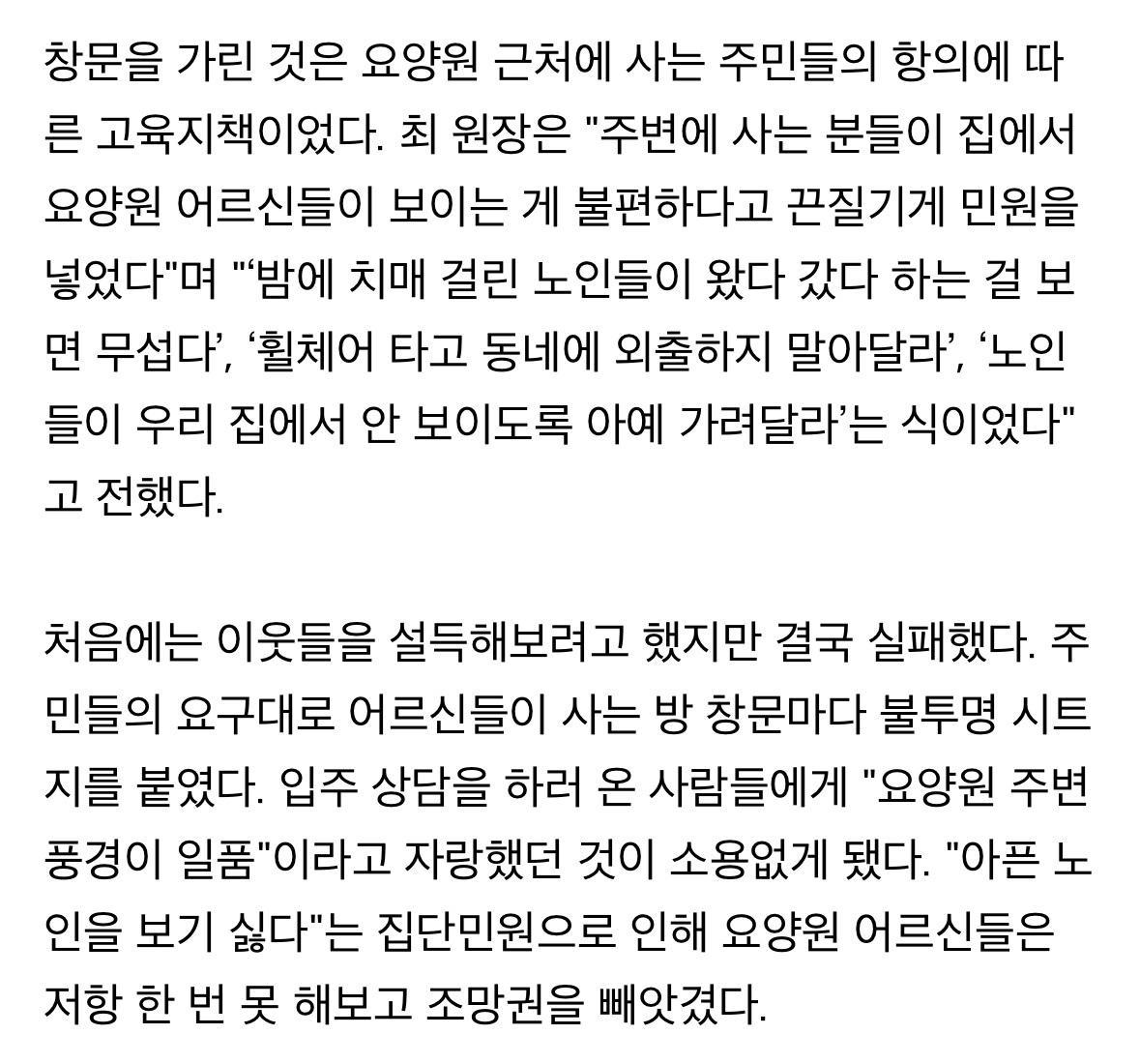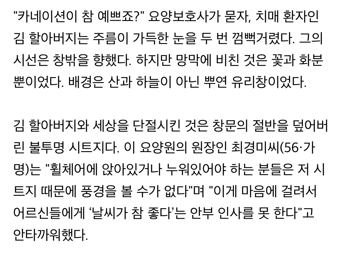 도탁스 (DOTAX) "노인 보기 싫다" 민원에 창문 가린 요양원…지금의 나는, 미래의 너다 작성시간25.04.13|조회수28,489 목록 댓글 18 글자크기 작게가 글자크기 크게가 다음검색 현재 게시글 추가 기능 열기 북마크 공유하기 신고 센터로 신고 댓글 18 댓글 리스트 작성시간 25.04.13 ㅁㅊ 작성시간 25.04.13 말같지도 않는 민원 넣는놈 개패는 법개정좀.. 작성시간 25.04.13 미친놈들인가... 작성시간 25.04.14 인간실격 작성시간 25.04.14 아파트에 미치니까 저 지랄하지 에휴 싹 다 망해야하는데 카페 방문해 더 많은 댓글 만나기!