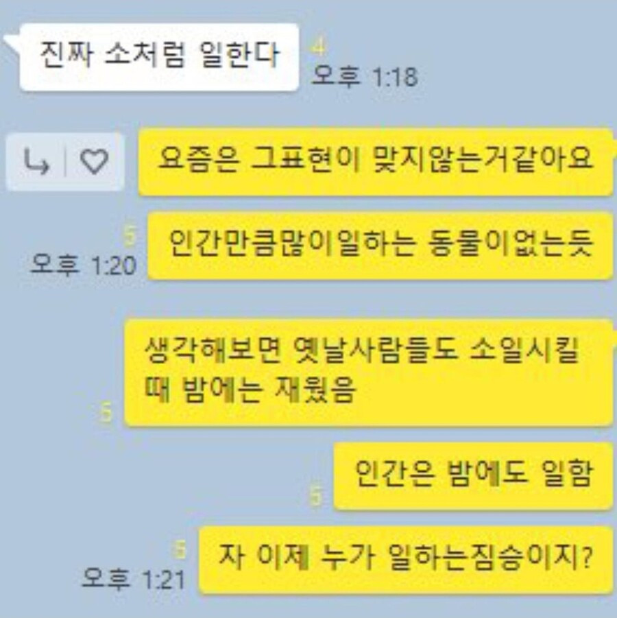 작성시간 25.04.17 그럼 너 정말 북한 소처럼 일한다로 바꾸면 되겠네