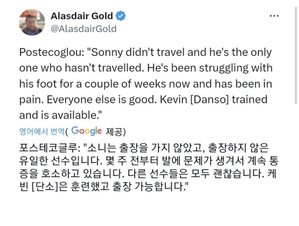 도탁스 (DOTAX) 손흥민, 유로파 8강 2차전 결장 작성시간25.04.17|조회수13,176 목록 댓글 4 글자크기 작게가 글자크기 크게가 다음검색 현재 게시글 추가 기능 열기 북마크 공유하기 신고 센터로 신고 댓글 4 댓글 리스트 작성시간 25.04.17 부상이였구나 어쩐지; 리그 왜 안나오나 했네 작성시간 25.04.17 이러면 뭐 이길 가능성 거의 없네 작성시간 25.04.17 올시즌도 무관이겠군 작성시간 25.04.17 아 담주 노팅엄경기보러가는데 미치겠네 설마 안나오나 카페 방문해 더 많은 댓글 만나기!