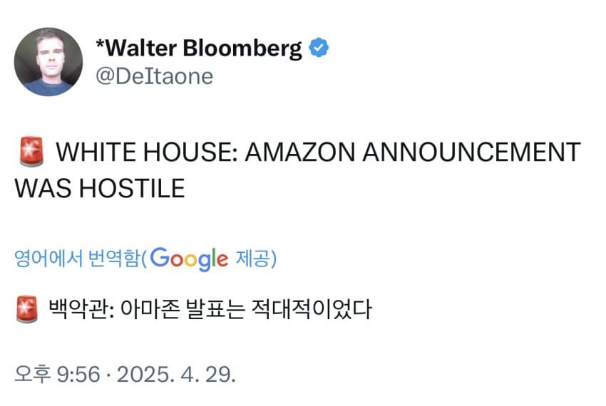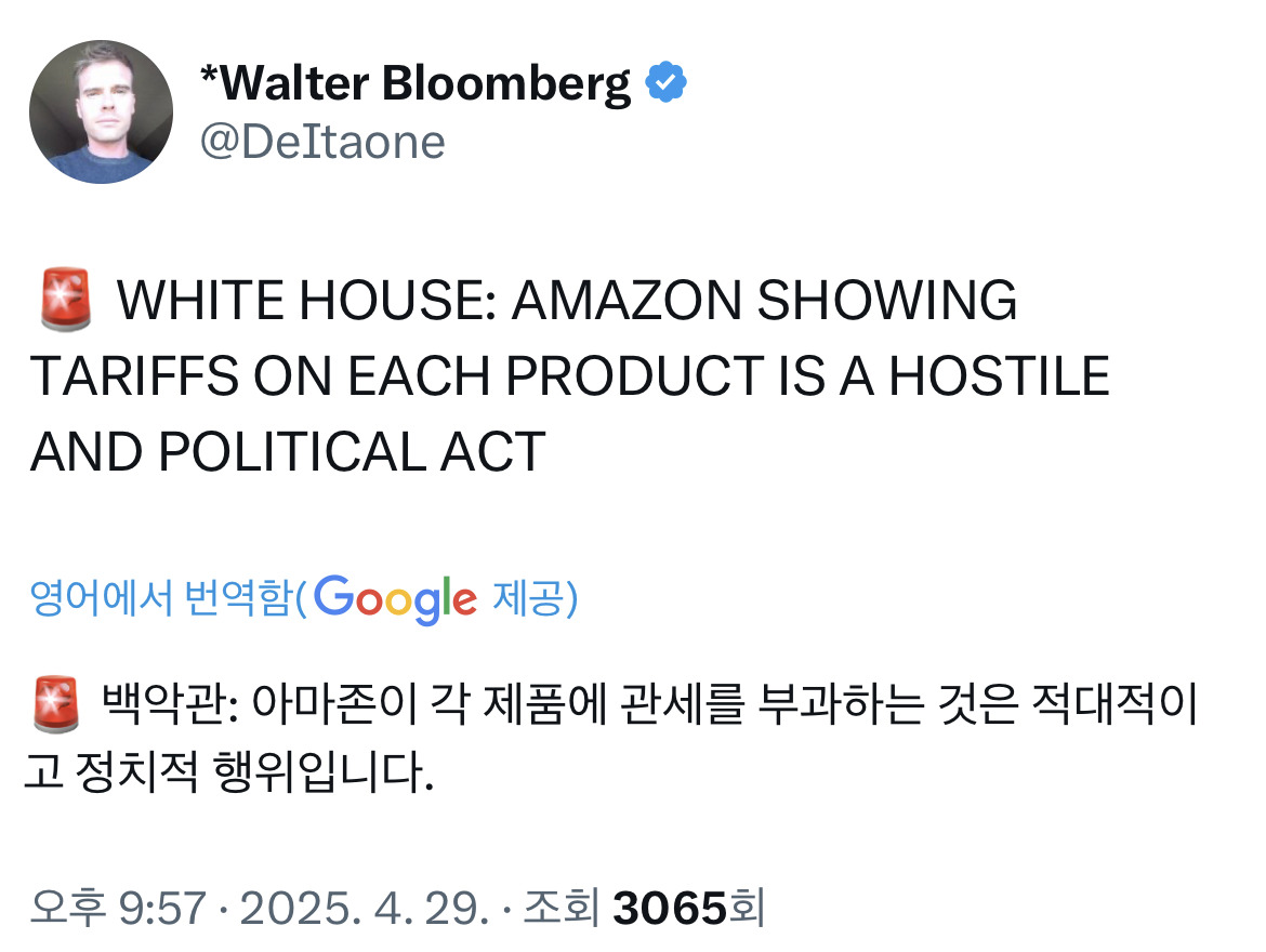 백악관 "아마존 각 제품에 관세 표시는 적대적이고 정치적 행위".twt 작성자내꿈은롯데우승보ㄱI|작성시간25.04.29|조회수4,955 목록 댓글 13 글자크기 작게가 글자크기 크게가 트럼프 빡침 ㄷㄷ 다음검색 현재 게시글 추가 기능 열기 북마크 공유하기 신고 센터로 신고 댓글 댓글 13 댓글쓰기 답글쓰기 댓글 리스트 작성자늑대_ | 작성시간 25.04.29 진정한 페미는 트럼프가 아니었을까 답댓글 작성자BrokenValentine | 작성시간 25.04.30 트페미 ㄷㄷㄷㄷㄷㄷ 작성자k1이스 | 작성시간 25.04.30 ㅋㅋㅋㅋㅋ 관세로 세금충당 응 니들돈이야 ㅋㅋㅋㅋㅋ 작성자Bakas | 작성시간 25.04.30 내가 하면 로맨스요 니가 하면 적대적 행위 와 진짜 누구 보는거 같네 ㅋㅋ 작성자피자치킨주세요2 | 작성시간 25.04.30 병신 댓글 전체보기