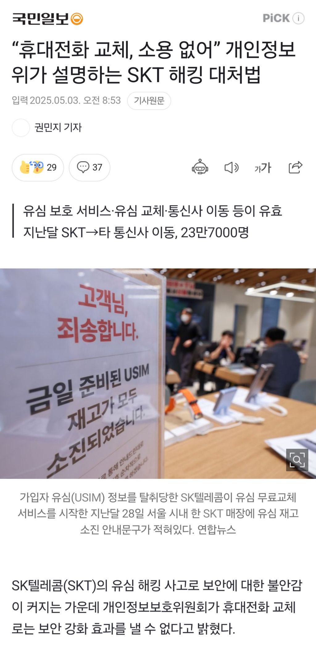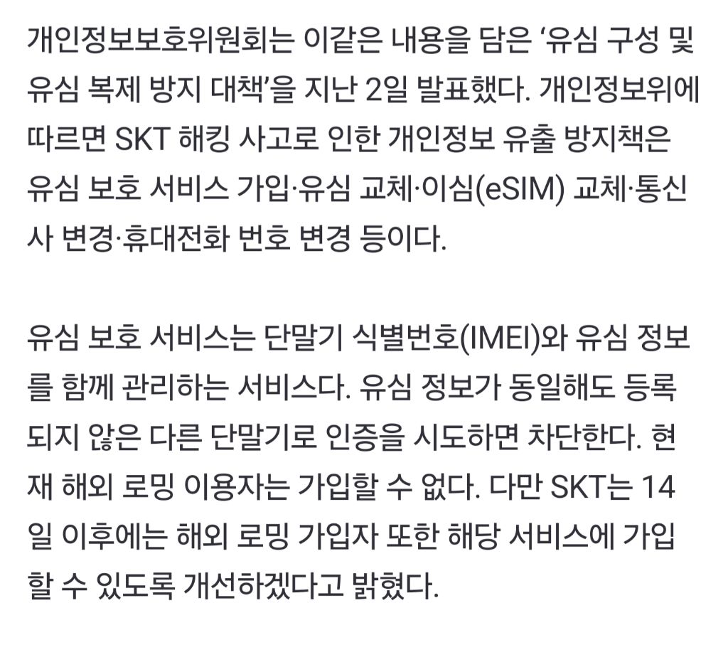 도탁스 (DOTAX) [[뉴스]]“휴대전화 교체, 소용 없어” 개인정보위가 설명하는 SKT 해킹 대처법 작성시간25.05.03|조회수15,581 목록 댓글 4 글자크기 작게가 글자크기 크게가 https://n.news.naver.com/article/005/0001774006?sid=103“휴대전화 교체, 소용 없어” 개인정보위가 설명하는 SKT 해킹 대처법SK텔레콤(SKT)의 유심 해킹 사고로 보안에 대한 불안감이 커지는 가운데 개인정보보호위원회가 휴대전화 교체로는 보안 강화 효과를 낼 수 없다고 밝혔다. 개인정보보호위원회는 이같은 내용을 n.news.naver.com 다음검색 현재 게시글 추가 기능 열기 북마크 공유하기 신고 센터로 신고 댓글 4 댓글 리스트 작성시간 25.05.03 무슨얘긴가했더니 유심 그대로 본체만 바꿨을때 얘기구나 작성시간 25.05.03 제목이 자극적인건가 몬소린가했네 작성시간 25.05.03 적어도 탈취당한 IMEI가 무의미해지고 그럼 유심을 복제해도 인증을 시도할 수 없으니 의미 있는거 아닌가? 작성시간 25.05.03 탈skt가즈아ㅏㅏㅏkt유심빨리와라 카페 방문해 더 많은 댓글 만나기!