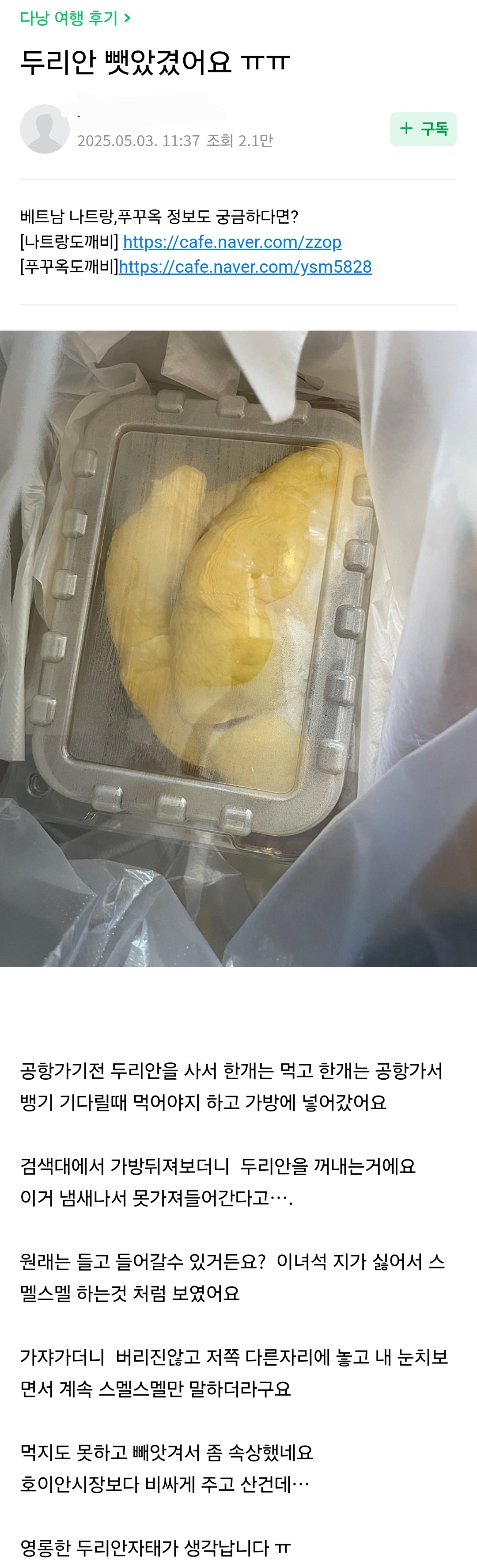 작성시간 25.05.04 호텔도 두리안 못가져 갈탠데?