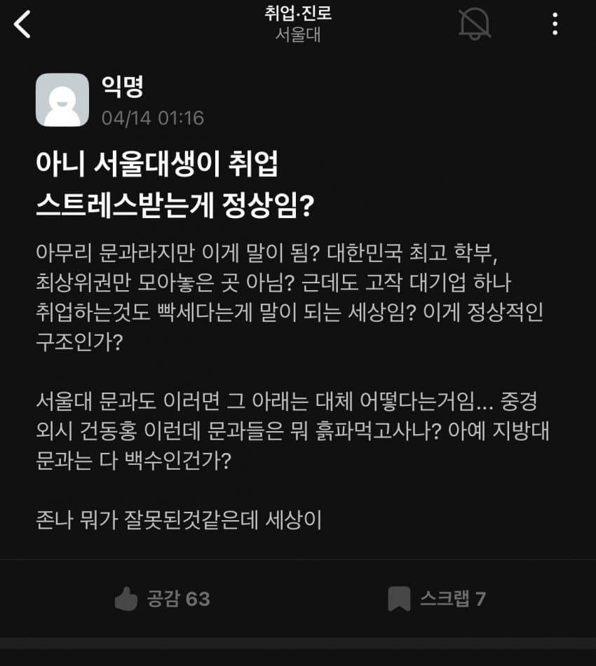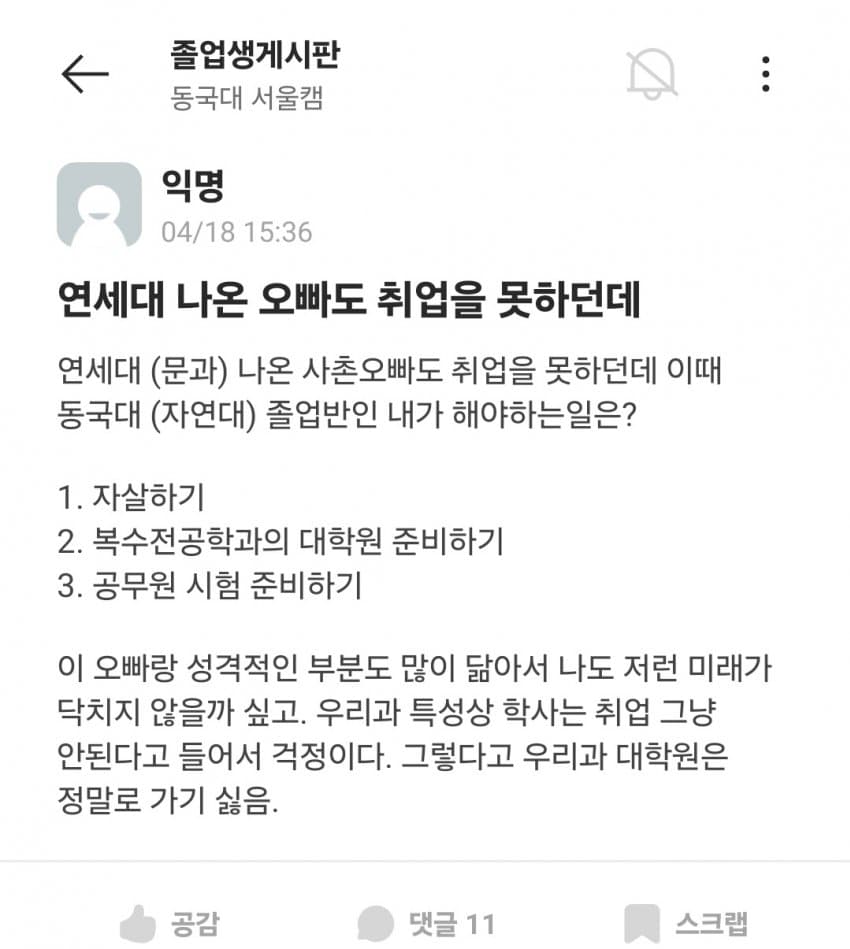 작성시간 25.05.05 고대인데 취준할때 쉽지않았음 현재는 해외서 사느라 관련없긴한데... 한국 돌아갔을때 좀 두려움