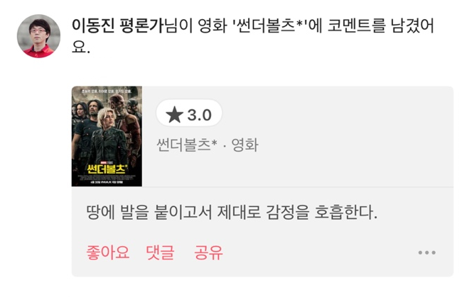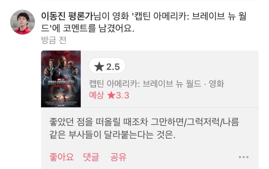 도탁스 (DOTAX) 이동진 썬더볼츠 평점 작성시간25.05.05|조회수9,003 목록 댓글 3 글자크기 작게가 글자크기 크게가 브레이브 뉴 월드 평점 다음검색 현재 게시글 추가 기능 열기 북마크 공유하기 신고 센터로 신고 댓글 3 댓글 리스트 작성시간 25.05.05 로비랑 같은 평점을 줬다는게 이해가 안가네 작성시간 25.05.05 윈태식이 돌아왔구나.. 작성시간 25.05.06 방금 봤는데 조연들 뭉친거 치곤 잘만듬 cg 전투씬 좋고 짜임새 있는 느낌브월드가 cg며 스토리며 중구난방 최악이었지 카페 방문해 더 많은 댓글 만나기!