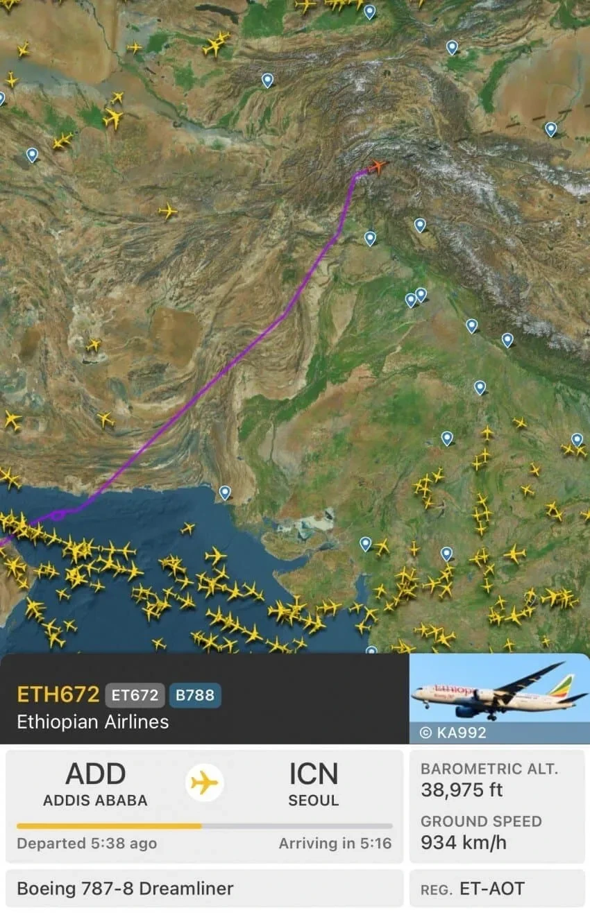 인천으로 오는 에티오피아 항공편
