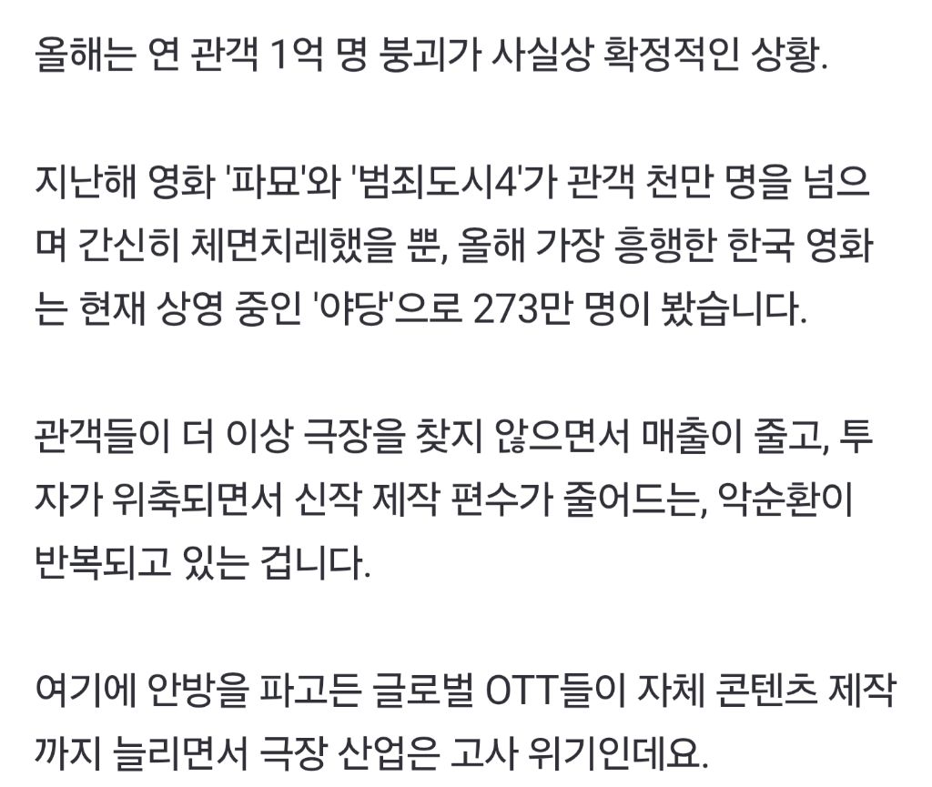 작성시간 25.05.12 그냥 한국영화가 재미없음 딱 ott공짜로 풀리면 볼만한 수준