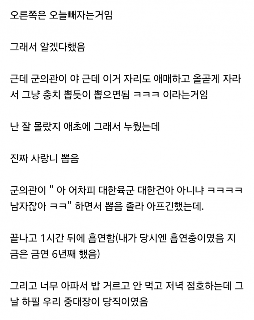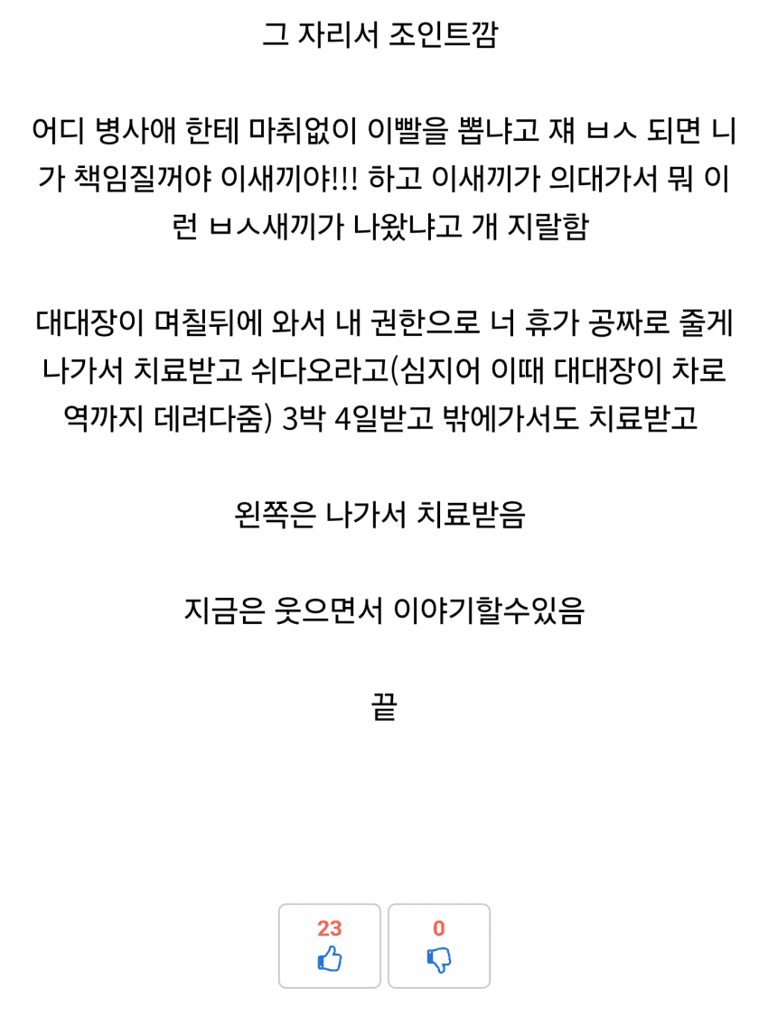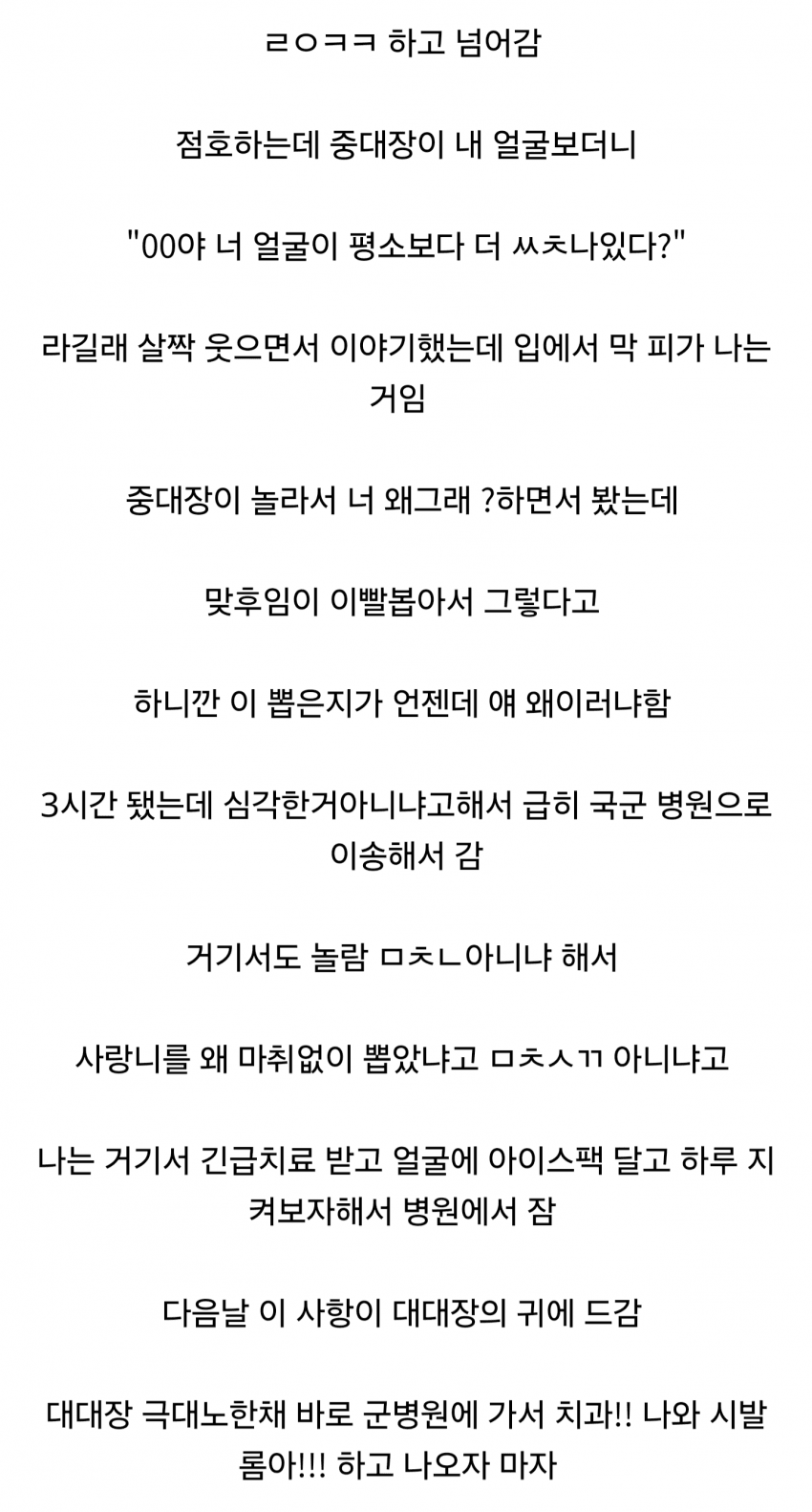 작성시간 25.05.13 ㅋㅋㅋ 뭔 대대장이 군의관 쪼인트를까 거진 다 존중해주는데