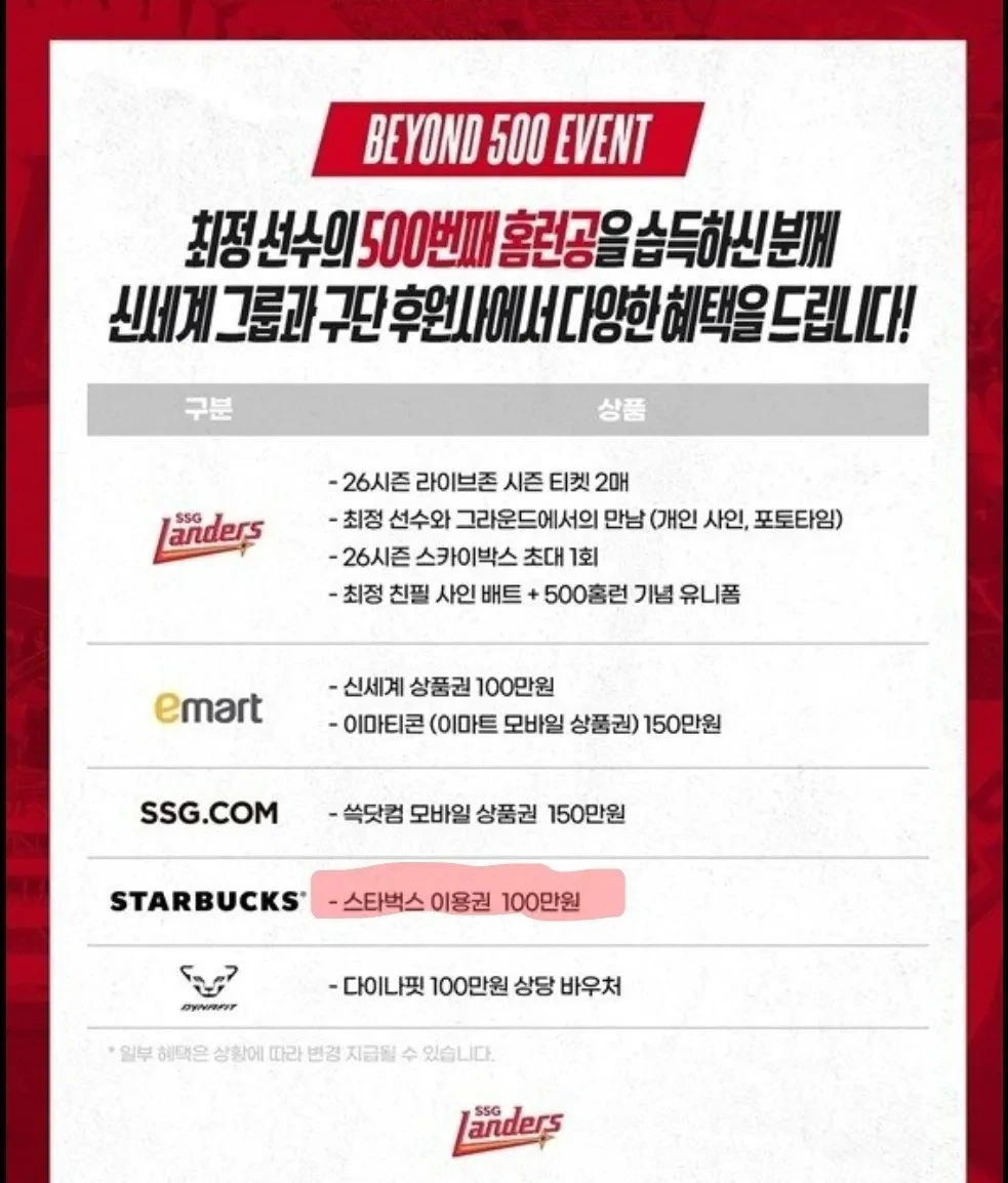 500호 홈런은 스벅100만원 이용권으로ㅎ