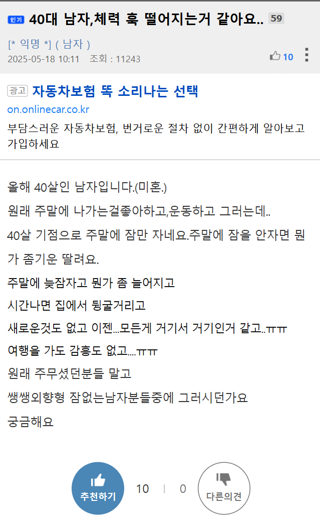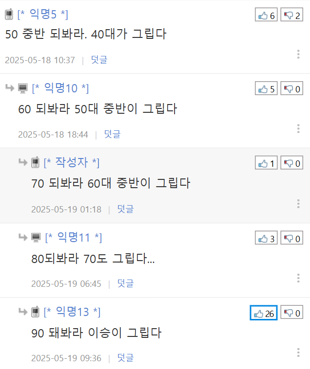 작성시간 25.05.19 사람이 항상 지금이 어린 나이라는걸 인지하지 못하는듯. 20대는 우스개소리로 늙었다하지만 30대는 찐으로 본인이 늙었다 생각하는 사람 많은것 같음