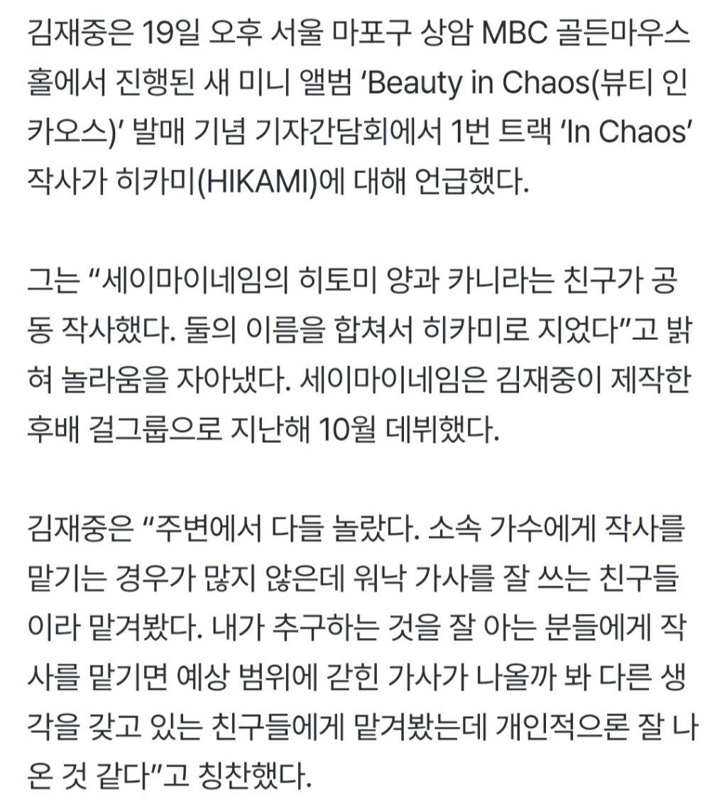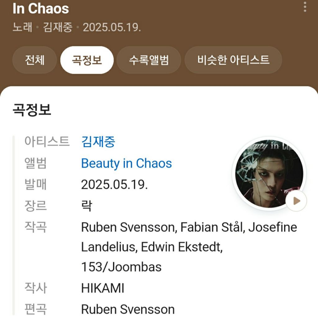 앨범 수록곡 중 In chaos 라는 노래의 작사가 HIKAMI임