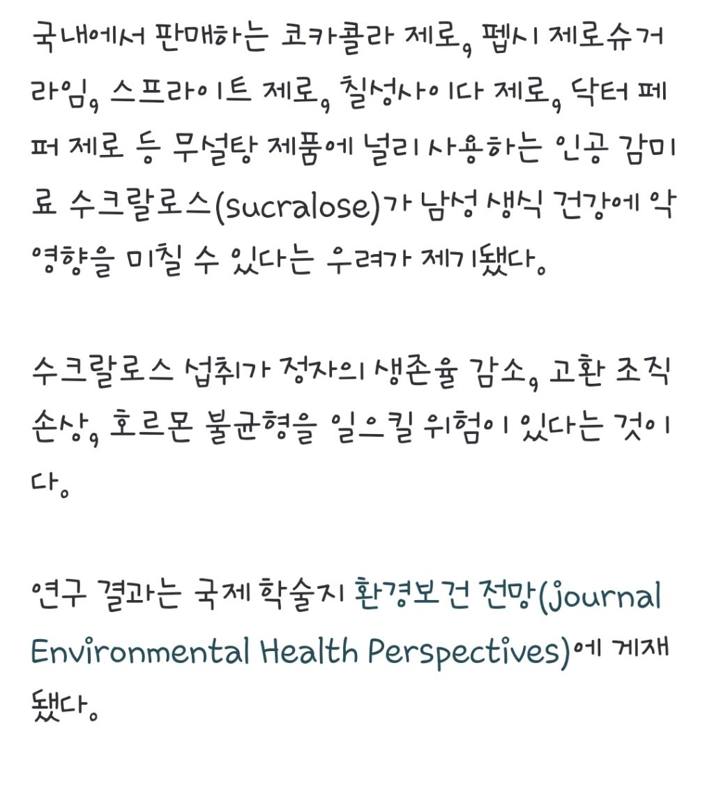 [[뉴스]]“제로음료 속 인공감미료, 남성 생식기능에 악영향” 작성자WJSN 이루다|작성시간25.05.24|조회수4,999 목록 댓글 33 글자크기 작게가 글자크기 크게가 https://n.news.naver.com/article/020/0003636985?sid=103“제로음료 속 인공감미료, 남성 생식기능에 악영향”국내에서 판매하는 코카콜라 제로, 펩시 제로슈거 라임, 스프라이트 제로, 칠성사이다 제로, 닥터 페퍼 제로 등 무설탕 제품에 널리 사용하는 인공 감미료 수크랄로스(sucralose)가 남성 생식 건강n.news.naver.com 다음검색 현재 게시글 추가 기능 열기 북마크 공유하기 신고 센터로 신고 댓글 댓글 33 댓글쓰기 답글쓰기 댓글 리스트 작성자스쿠버프리다이버 | 작성시간 25.05.24 설탕 로비 존나하네 작성자수신번호 | 작성시간 25.05.24 ㅋㅋ 응 어차피 사용 못해~ 작성자융융이다 | 작성시간 25.05.24 아 ㅋㅋ 자체 피임 ㅋㅋ안묶어도 되겠다 ㅋㅋㅋㅋ 작성자반갑세피나 | 작성시간 25.05.24 설탕은 뭐 불로초임?ㅋㅋㅋ 작성자안하는것과못하는것은엄연히다르지요 | 작성시간 25.05.24 출산율 최저라서 타격이 읍네 이제 ㅋㅋㅋ 물마실거 아니면 제로가 나음 유튜브고 티비고간에 술 졸라 마시더만 댓글 전체보기