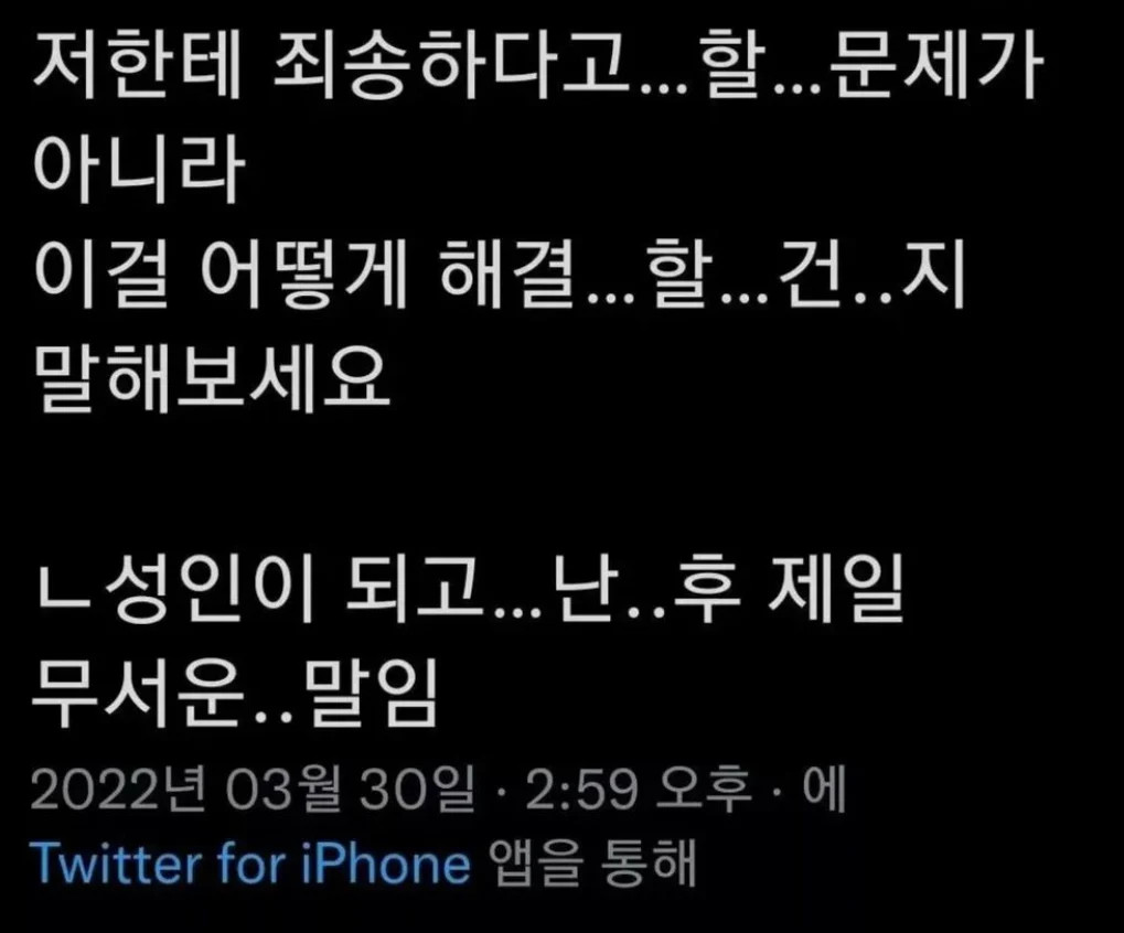 도탁스 (DOTAX) 성인이되고 제일 무서운말 작성시간25.06.02|조회수25,830 목록 댓글 3 글자크기 작게가 글자크기 크게가 히이이익 다음검색 현재 게시글 추가 기능 열기 북마크 공유하기 신고 센터로 신고 댓글 3 댓글 리스트 작성시간 25.06.02 죄송하면 다야?! 작성시간 25.06.02 죄송하면 군생활 끝나냐? 작성시간 25.06.02 (진짜 ㅈ됐을때) 야 너 어떡하냐... 이거 좀 심각한데.. 카페 방문해 더 많은 댓글 만나기!