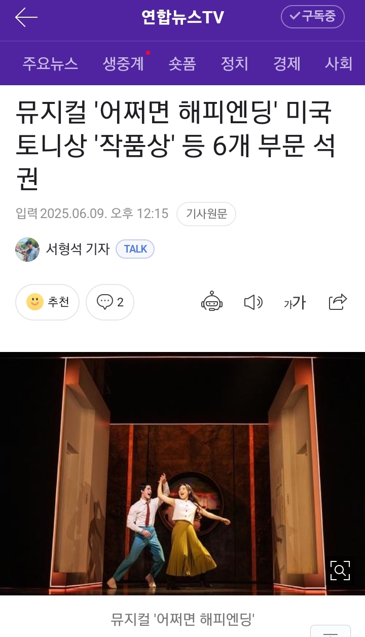 2025 토니상 10개 부문에 후보로 이름을 올렸던 뮤지컬 '어쩌면 해피엔딩'은 작품상과 극본상, 무대디자인상, 작사·작곡상, 연출상, 남우주연상을 받았습니다.
