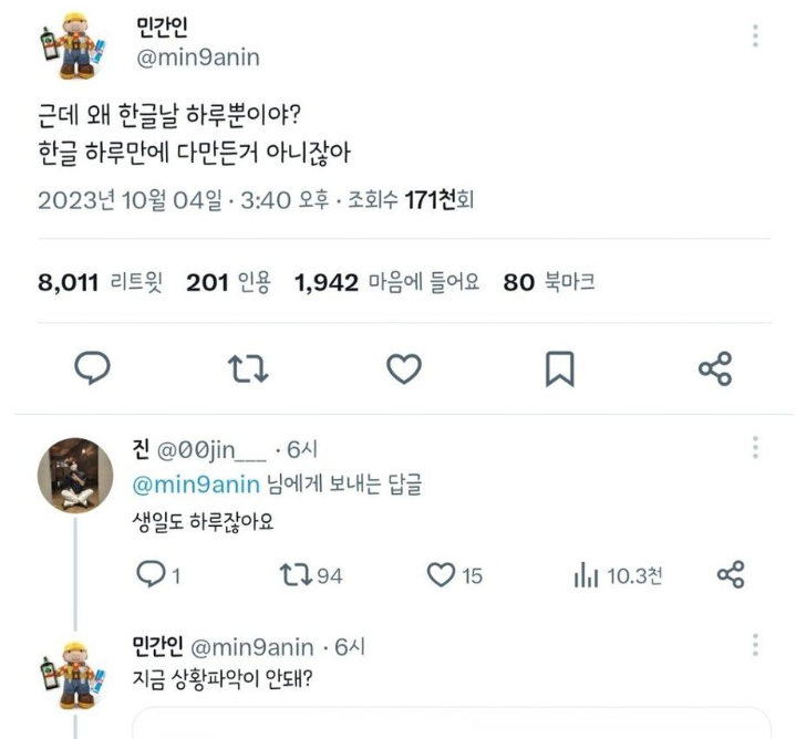 도탁스 (DOTAX) 왜 한글날은 하루뿐이야? 작성시간25.06.16|조회수26,715 목록 댓글 15 글자크기 작게가 글자크기 크게가 다음검색 현재 게시글 추가 기능 열기 북마크 공유하기 신고 센터로 신고 댓글 15 댓글 리스트 답댓글 작성시간 25.06.16 사측이세요? 답댓글 작성시간 25.06.16 네 답댓글 작성시간 25.06.16 작성시간 25.06.16 넌 씨X 눈치가 없어? 작성시간 25.06.16 ㅋㅋㅋㅋㅋㅋㅋ 카페 방문해 더 많은 댓글 만나기!