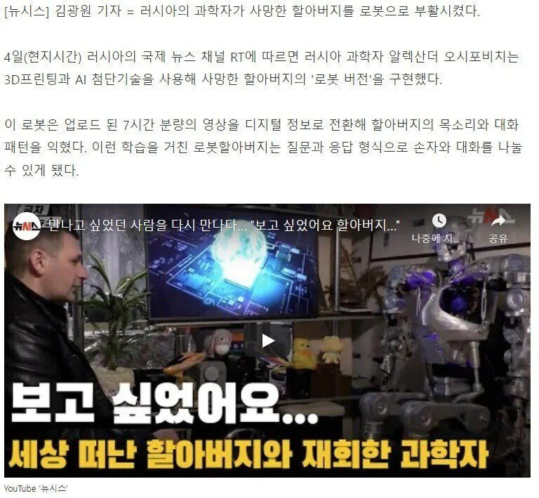 도탁스 (DOTAX) 죽은 할아버지를 로봇으로 부활시킨 러시아 과학자 작성시간25.06.19|조회수9,677 목록 댓글 6 글자크기 작게가 글자크기 크게가 다음검색 현재 게시글 추가 기능 열기 북마크 공유하기 신고 센터로 신고 댓글 6 댓글 리스트 답댓글 작성시간 25.06.19 ???:할아버지 요새는 이 처자가 좋아 작성시간 25.06.19 헉 작성시간 25.06.19 어이어이 서버 이름이 스카이넷은 아니겠지 작성시간 25.06.19 아니?? 작성시간 25.06.19 역시 로봇의 원조국가 카페 방문해 더 많은 댓글 만나기!