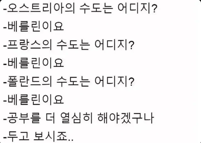 도탁스 (DOTAX) 유럽 국가들의 수도 작성시간25.09.02|조회수10,433 목록 댓글 2 글자크기 작게가 글자크기 크게가 다음검색 현재 게시글 추가 기능 열기 북마크 공유하기 신고 센터로 신고 댓글 2 댓글 리스트 작성시간 25.09.02 2차대전때 이미 저랬... 작성시간 25.09.02 미대생은 말이 아닌 행동으로 한다 카페 방문해 더 많은 댓글 만나기!