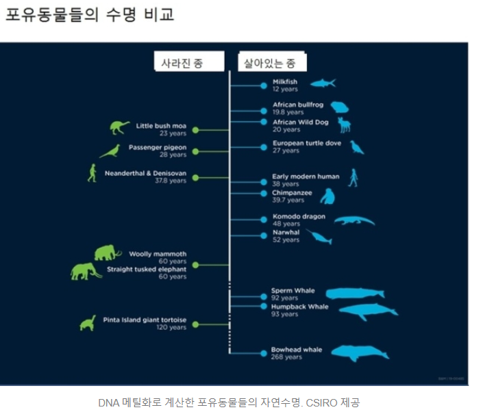 오스트레일리아 연방과학원(CSIRO)의 분자생물학자 벤저민 메인(Benjamin Mayne)과 웨스턴오스트레일리아대 연구진은 포유동물들의 디엔에이를 분석한 결과, 메틸화가 진행되는 시피지(CpG) 부위의 밀도가 수명과 일정한 관계가 있다는 사실을 밝혀냈다.