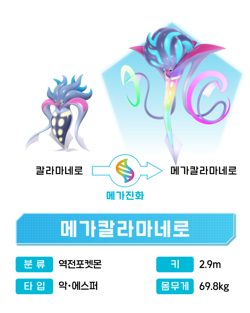 에스퍼/악 타입에 최면술이 특기인 포켓몬 칼라마네로에 관한 마케팅이 쏟아져서 메가칼라마네로 출시가 확신되는 분위기였는데