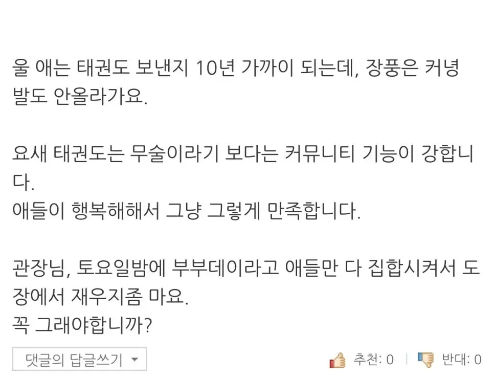 도탁스 (DOTAX) 애기들 태권도장 보낸 아버님 후기 작성시간25.09.18|조회수10,250 목록 댓글 6 글자크기 작게가 글자크기 크게가 다음검색 현재 게시글 추가 기능 열기 북마크 공유하기 신고 센터로 신고 댓글 6 댓글 리스트 작성시간 25.09.18 원생 늘리는 관장님 작성시간 25.09.18 동생 만들어서 동생도 태권도장 등록 시키라는 뜻 작성시간 25.09.18 관장님은 합법적으로 피하시네? 작성시간 25.09.18 ㅋㅋㅋㅋㅋㅋㅋㅋ 작성시간 25.09.18 부부데이 ㅋㅋ 카페 방문해 더 많은 댓글 만나기!