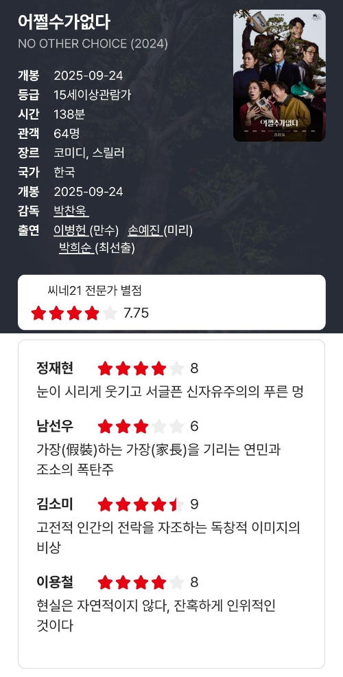 작성시간 25.09.19 볼지 말지 참고할거면 전문가평은 아무의미없음 일반 대중들 평이 중요하지