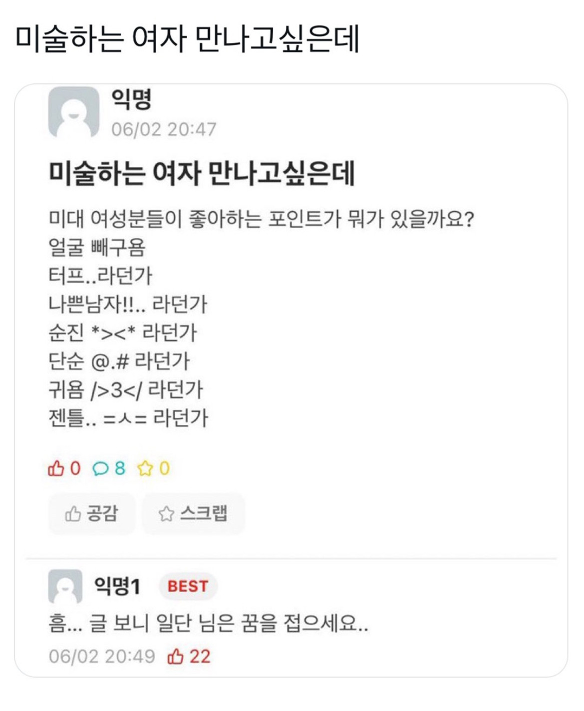 도탁스 (DOTAX) 미술하는 여자 만나고 싶은데 작성시간25.11.05|조회수24,837 목록 댓글 10 글자크기 작게가 글자크기 크게가 다음검색 현재 게시글 추가 기능 열기 북마크 공유하기 신고 센터로 신고 댓글 10 댓글 리스트 작성시간 25.11.05 꿈을 접어드림 작성시간 25.11.05 공대인데 공대남같지않아서 만남 작성시간 25.11.05 ㅋㅋㅋㅋㅋㅋ싫다.. 작성시간 25.11.05 말투...ㅅㅂ ㅋㅋ 작성시간 25.11.05 왜저래; 카페 방문해 더 많은 댓글 만나기!