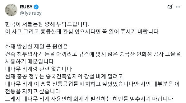 규격에 안맞는 싸구려 인화성 녹색 그물망 때문이라는 말이 많음