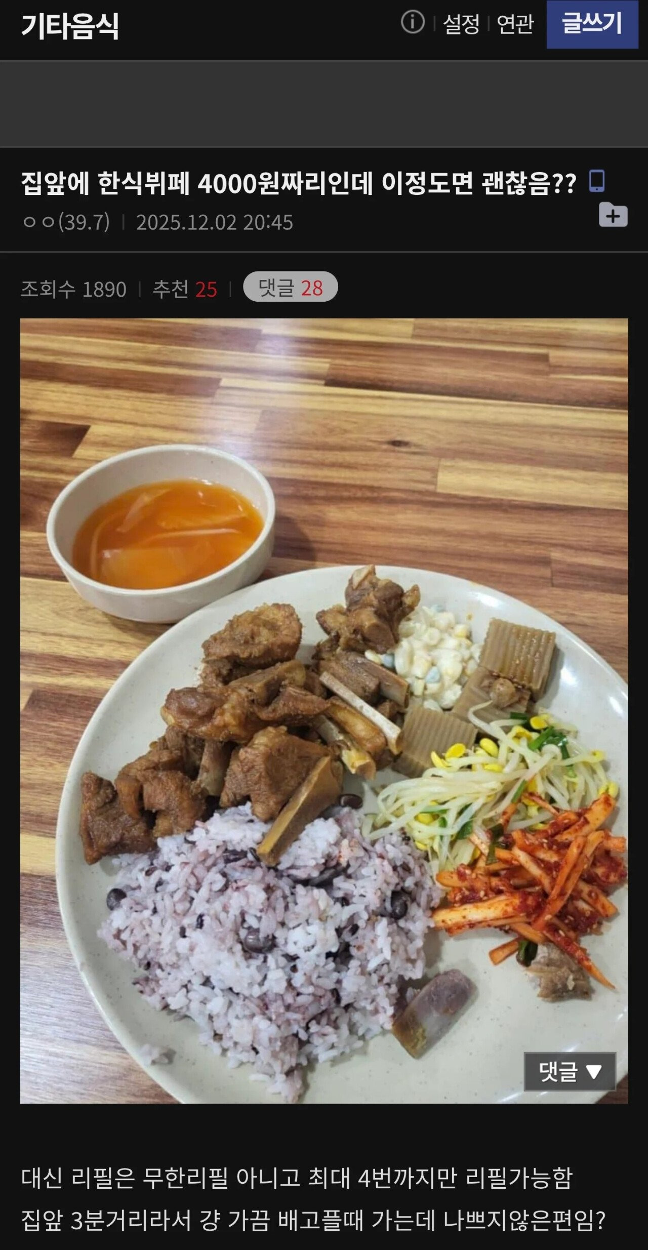 우리집 근처 한식뷔페 6천원인데 거기도 갈때마다 남는게 있나 싶던데 4천원이면 ㄷㄷ -