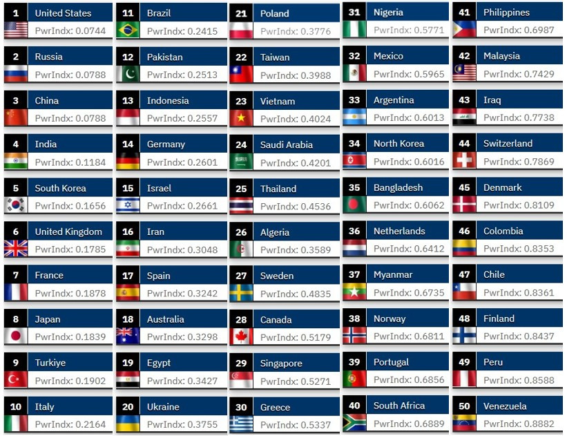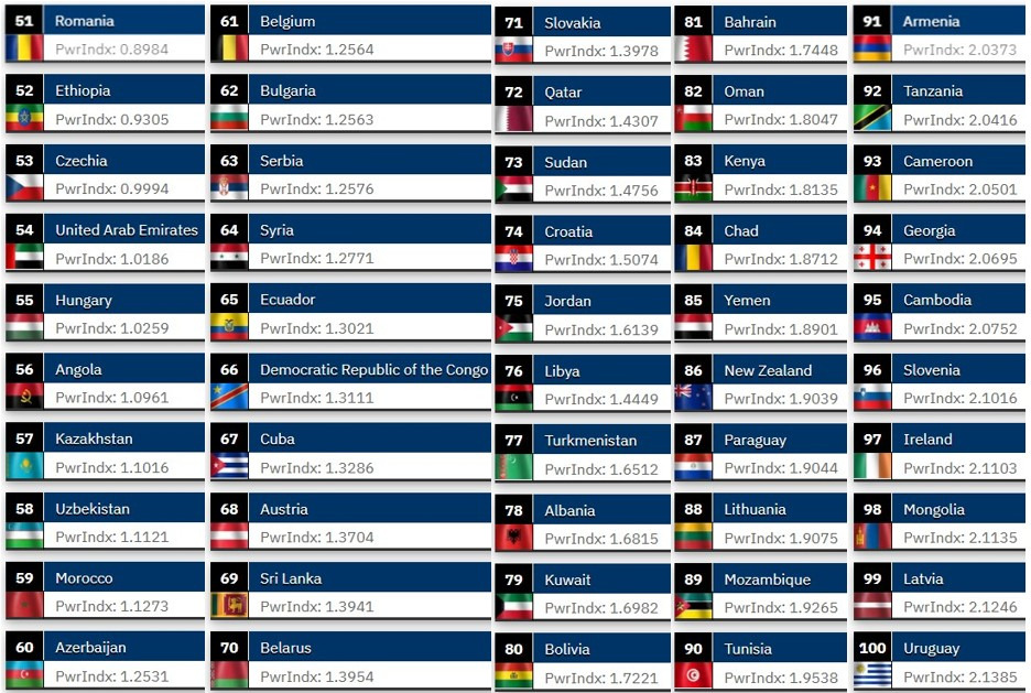 도탁스 (DOTAX) 2025 세계 군사력 순위 TOP 100 작성시간25.12.14|조회수7,359 목록 댓글 15 글자크기 작게가 글자크기 크게가 다음검색 현재 게시글 추가 기능 열기 북마크 공유하기 신고 센터로 신고 댓글 15 댓글 리스트 작성시간 25.12.14 뭔소리여.. 아직도 부족하구만 부족해!!! 작성시간 25.12.14 95위가 25위한테 까불었네.. 작성시간 25.12.14 보통 이런 건 핵은 빼고 계산하나 작성시간 25.12.14 캄보디아 어디있나.. 작성시간 25.12.14 아무쓸데없음. 핵이 압살이라 카페 방문해 더 많은 댓글 만나기!
