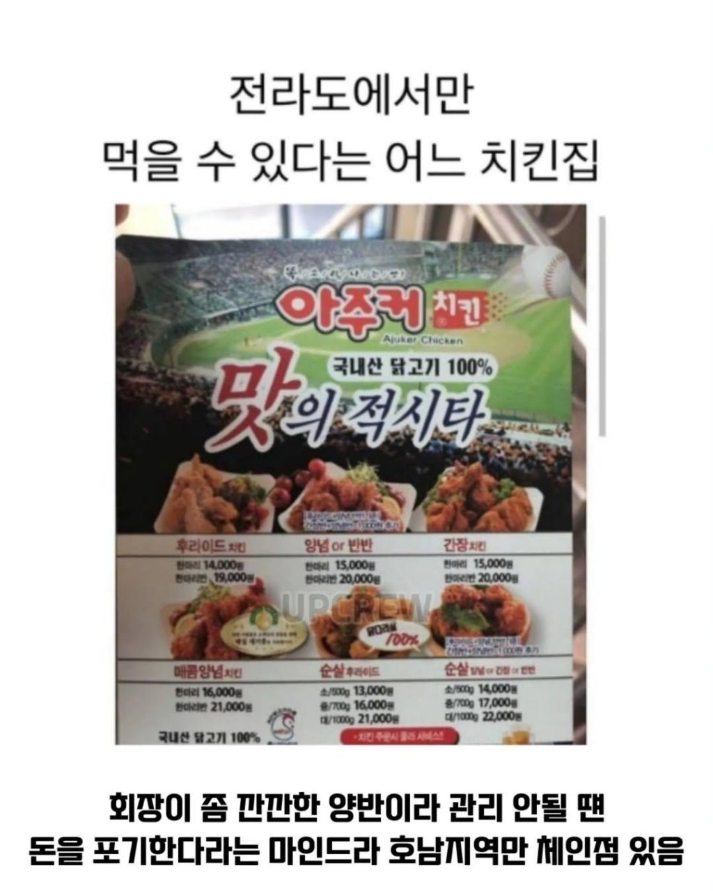 전라도에서만 먹을 수 있다는 치킨ㄷㄷㄷㄷ 작성자우주소녀보나t|작성시간25.12.29|조회수94,578 목록 댓글 22 글자크기 작게가 글자크기 크게가 다음검색 현재 게시글 추가 기능 열기 북마크 공유하기 신고 센터로 신고 댓글 댓글 22 댓글쓰기 답글쓰기 댓글 리스트 작성자려름 | 작성시간 25.12.30 구구 ! 작성자Cster | 작성시간 25.12.30 먼가 깔끔한 맛 후라이드는ㅋㅋ 작성자아무렇지 않은척 | 작성시간 25.12.30 맛있음 본가 갈때마다 먹음 작성자화순군민 | 작성시간 25.12.30 페리카나랑 비슷하다 보면 됨ㅋㅋ 작성자광주동네이장 | 작성시간 25.12.30 페리카나랑 비슷함ㅋㅋㅋㅋㅋ올해도 한번 먹었음 ㅎㅎ 댓글 전체보기