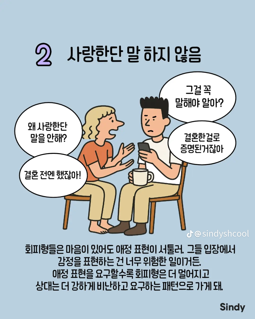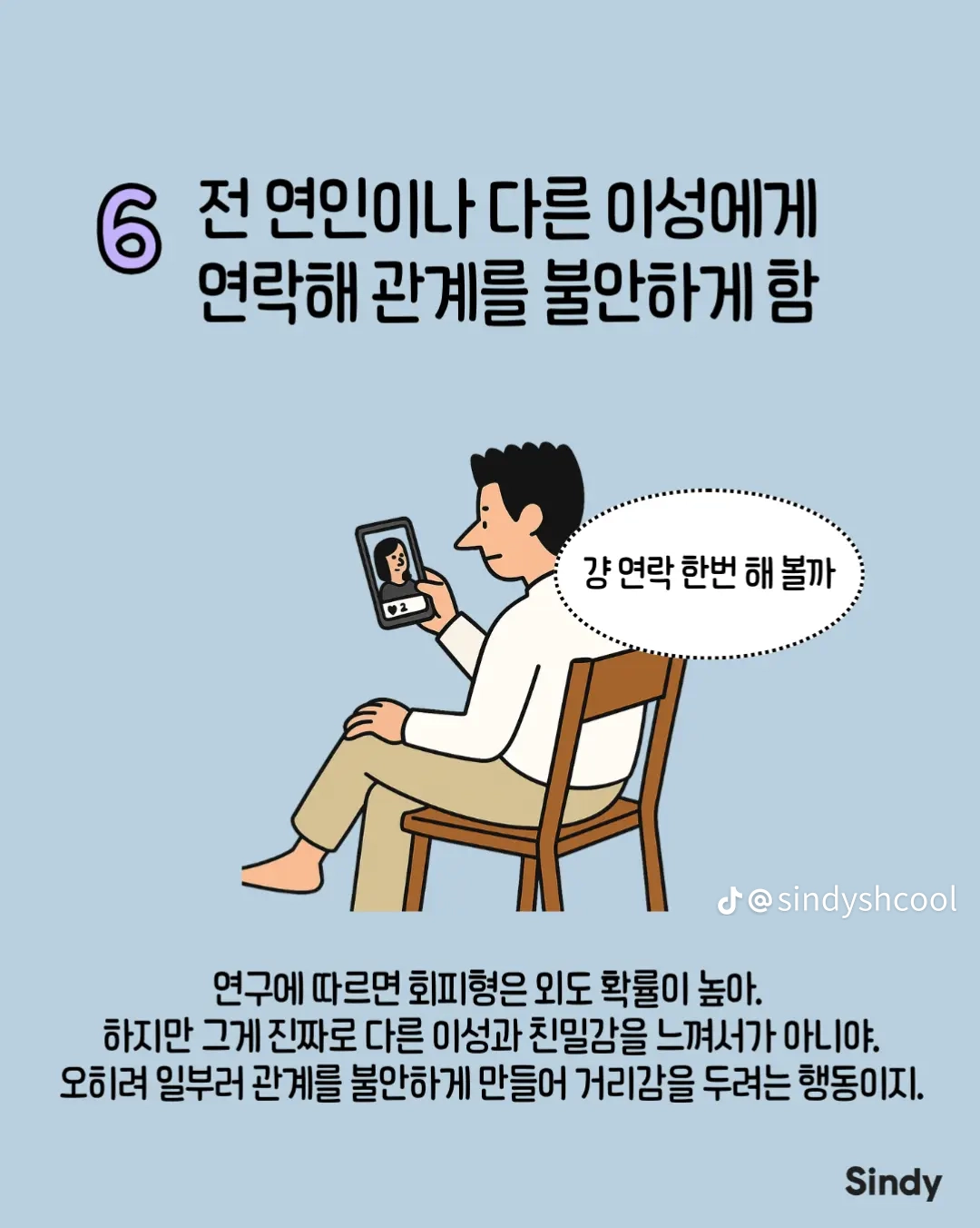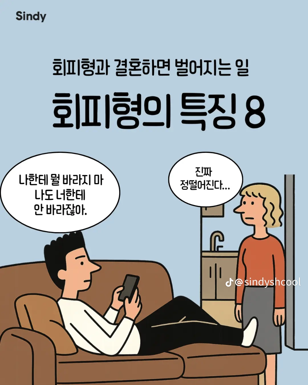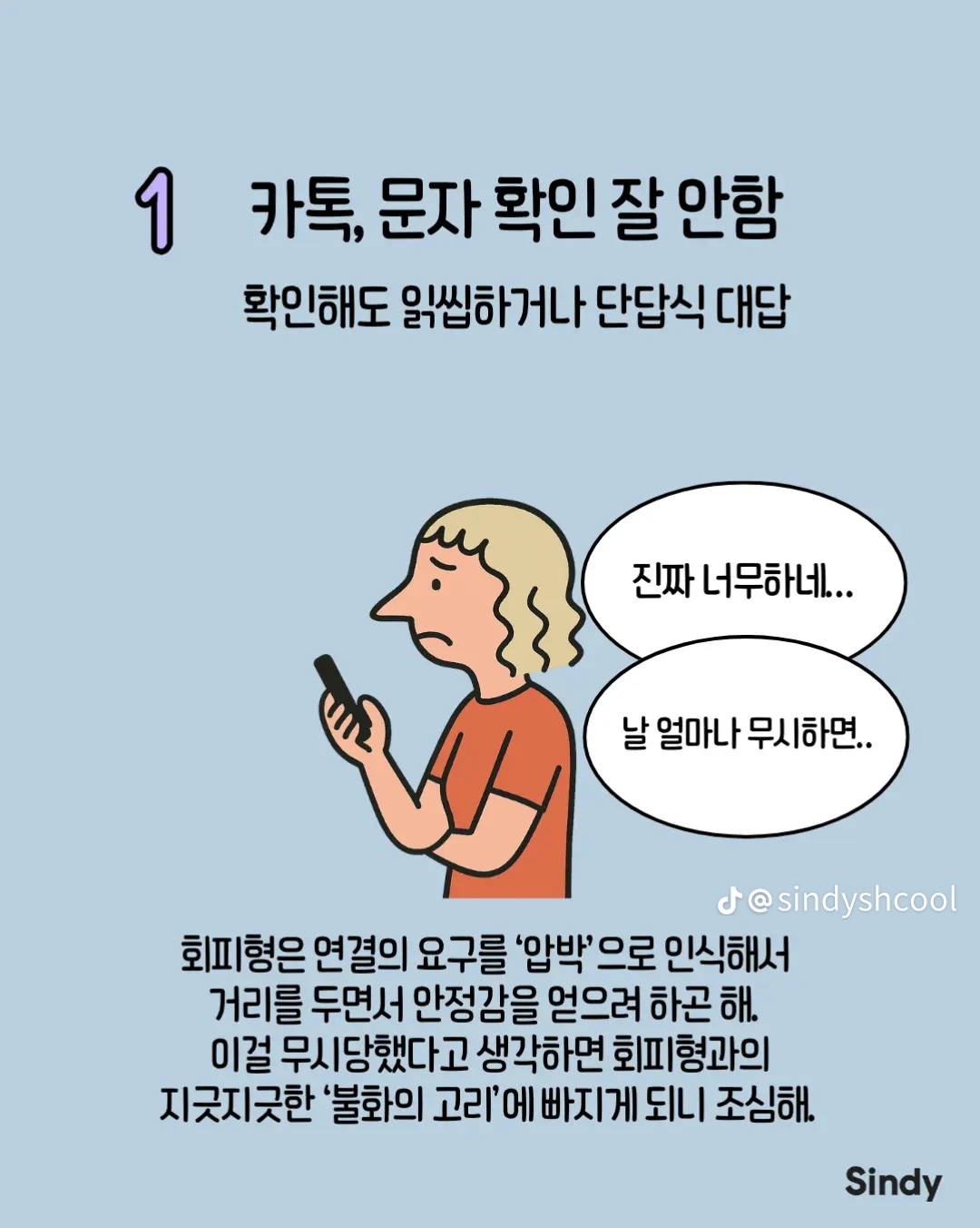 회피형의 특징 8가지 작성자둘기얏|작성시간25.12.30|조회수4,965 목록 댓글 19 글자크기 작게가 글자크기 크게가 다음검색 현재 게시글 추가 기능 열기 북마크 공유하기 신고 센터로 신고 댓글 댓글 19 댓글쓰기 답글쓰기 댓글 리스트 작성자안하는것과못하는것은엄연히다르지요 | 작성시간 25.12.30 집착 가스라이팅을 상대가 회피형이라 치부하는 사람들 개많늠 , 본인부터 돌아보시길 답댓글 작성자올인럽 | 작성시간 25.12.30 ㄹㅇ 작성자사막고글 | 작성시간 25.12.30 저런사람은 혼자살지 결혼은 왜 하는거 작성자국밥충 | 작성시간 25.12.30 나 아니었네 ㅋ 작성자GoonDin | 작성시간 25.12.30 존나 회피형인데 반이상이 아닌거 같은데 댓글 전체보기