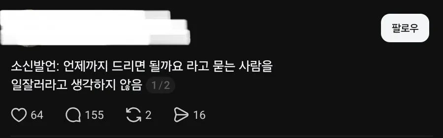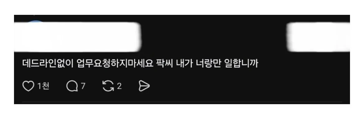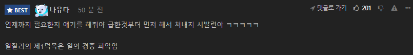 일 못하는 사람은 업무일정 물어본다고 함 작성자多주|작성시간25.12.30|조회수5,733 목록 댓글 30 글자크기 작게가 글자크기 크게가 바로 욕먹음 다음검색 현재 게시글 추가 기능 열기 북마크 공유하기 신고 센터로 신고 댓글 댓글 30 댓글쓰기 답글쓰기 댓글 리스트 작성자챙이챙이 | 작성시간 25.12.30 마감일을 묻지말라니 ㅋㅋㅋㅋㅋ 작성자흠냥흠냐 | 작성시간 25.12.30 ㅋㅋㅋㅋㅋㅋㅋ개패고싶네 장난치냐 작성자NORU | 작성시간 25.12.30 하여간 쓰레드 사짜들 작성자그라믄안댕 | 작성시간 25.12.30 관리자 필수역량중 하나가 직원 일정관리라고 NCS에서 규정한것도 있음 작성자미르별 | 작성시간 25.12.30 일 해본 적 없나?ㅋㅋㅋㅋㅋㅋㅋㅋㅋㅋㅋㅋ 댓글 전체보기