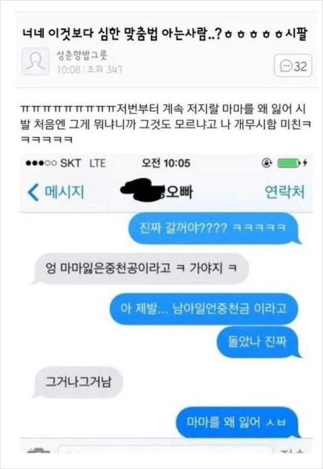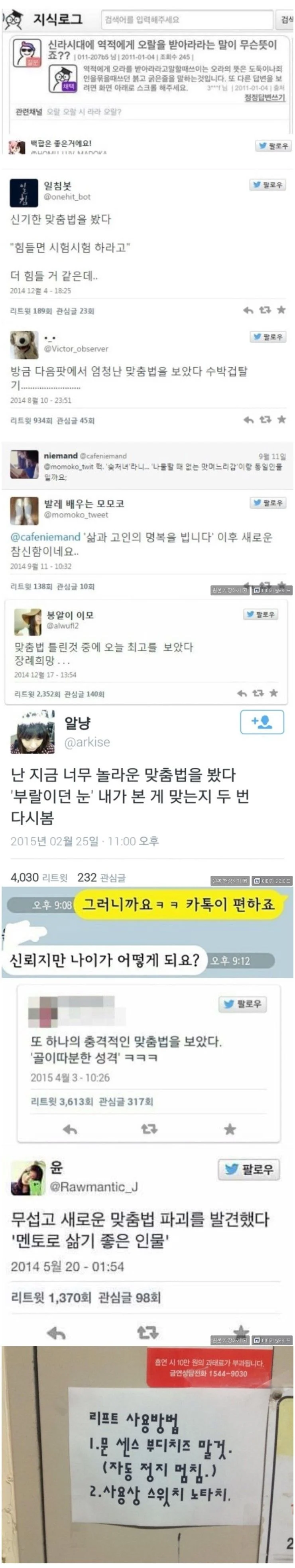 오랜만에 보면 재밌는 맞춤법ㅋㅋ 작성자흰둥이짱구|작성시간25.12.31|조회수3,693 목록 댓글 17 글자크기 작게가 글자크기 크게가 낳놋고 기억자 몰르는 사람들ㅋㅋ 다음검색 현재 게시글 추가 기능 열기 북마크 공유하기 신고 센터로 신고 댓글 댓글 17 댓글쓰기 답글쓰기 댓글 리스트 작성자꾸래핑 | 작성시간 25.12.31 ㅋㅋㅋㅋㅋㅋㅋㅋㅋㅋㅋㅋㅋㅋㅋㅋ 진짜... 진심인 사람들인 거 같아서 재밌음 작성자이름잘짓는사람 | 작성시간 25.12.31 곱셈추위 골이따분한은 말이 되네 ㅋㅋㅋㅋ 정상참작 작성자wnwhale | 작성시간 25.12.31 궁곳질은 처음 보네 ㅅㅂㅋㅋㅋㅋㅋㅋㅋㅋㅋㅋㅋ 작성자유예삼 | 작성시간 25.12.31 진짜 할많하않 작성자부리부리 대마왕 | 작성시간 25.12.31 지독하다 지독해ㅋㅋ 댓글 전체보기