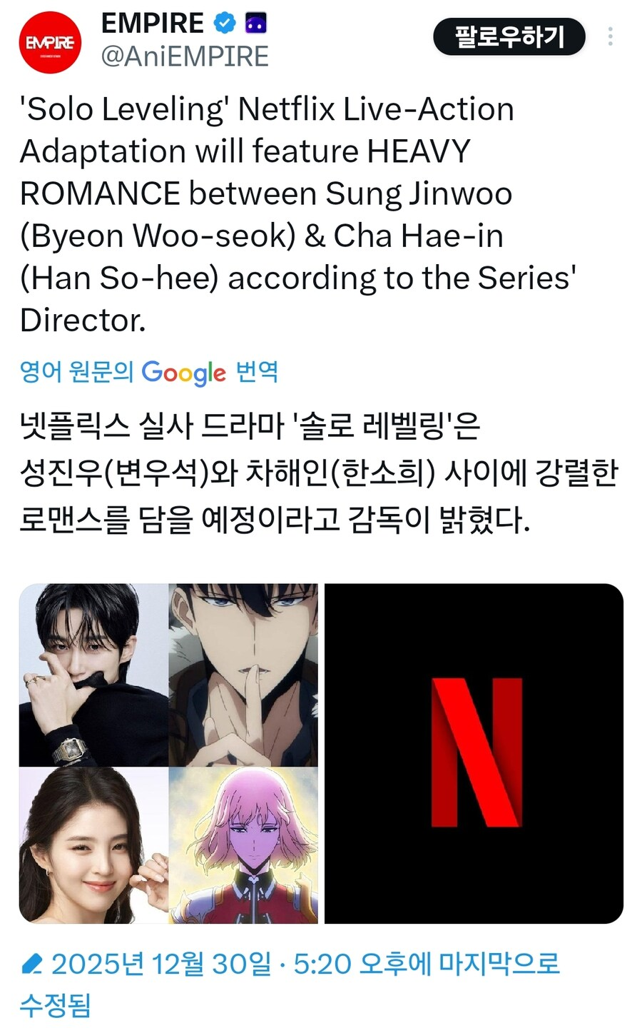 나혼렙 실사화 드라마 근황.jpg 작성자우주소녀보나t|작성시간25.12.31|조회수10,775 목록 댓글 59 글자크기 작게가 글자크기 크게가 한국 드라마식 로맨스 들어 갈 예정 다음검색 현재 게시글 추가 기능 열기 북마크 공유하기 신고 센터로 신고 댓글 댓글 59 댓글쓰기 답글쓰기 댓글 리스트 작성자지좋아 | 작성시간 25.12.31 전독시꼴 나겠네 그림자들 야스씬 있으면 ㅇㅈ 작성자두개의 | 작성시간 25.12.31 미친놈들아 원작 안봣냐? 뭔 로맨스물이야 ㅅㅂ 작성자은빛뀨 | 작성시간 25.12.31 k 각본 ㅋ 수고 작성자sadapple | 작성시간 25.12.31 응 전독시꼴나 ㅋㅋㅋㅋ 작성자향단비 | 작성시간 26.01.01 있는그대로도못만들면서 뭔감독인지ㅋㅋ 댓글 전체보기