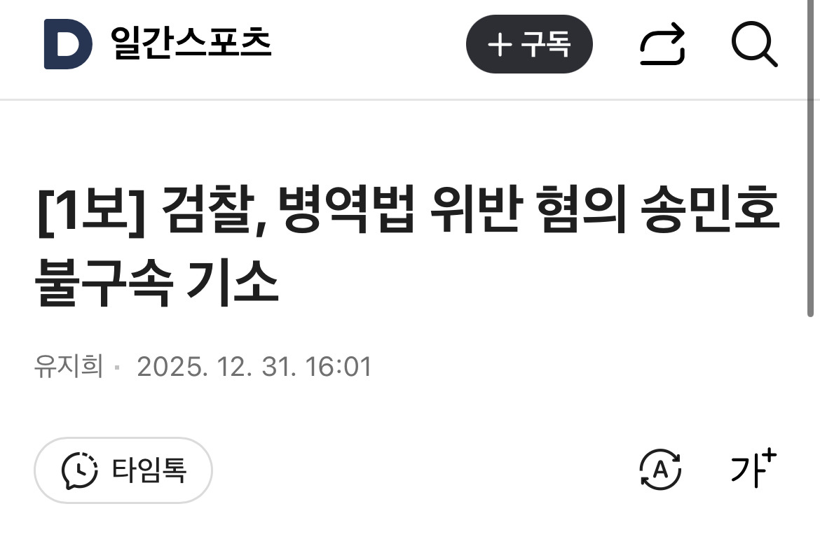 검찰, 병역법 위반 혐의 송민호 불구속 기소 작성자충무공 이순신|작성시간25.12.31|조회수1,692 목록 댓글 2 글자크기 작게가 글자크기 크게가 https://v.daum.net/v/20251231160122500 다음검색 현재 게시글 추가 기능 열기 북마크 공유하기 신고 센터로 신고 댓글 댓글 2 댓글쓰기 답글쓰기 댓글 리스트 작성자오라아라 | 작성시간 25.12.31 이걸 이제서야… 작성자왈왈컹컹 | 작성시간 25.12.31 이게 디스패치는 아니겟지? 댓글 전체보기