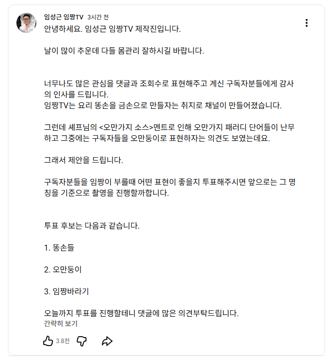 임짱tv 구독자 애칭 투표 작성자Melo|작성시간25.12.31|조회수6,145 목록 댓글 15 글자크기 작게가 글자크기 크게가 투표 없음 다음검색 현재 게시글 추가 기능 열기 북마크 공유하기 신고 센터로 신고 댓글 댓글 15 댓글쓰기 답글쓰기 댓글 리스트 작성자맛있는수박 | 작성시간 25.12.31 ㅋㅋㅋㅋㅋㅋㅋㅋㅋㅋㅋㅋ 작성자빨간지붕 | 작성시간 25.12.31 ㅋㅋㅋㅋㅋㅋㅋㅋㅋㅋㅋㅋㅋ 작성자북북벅벅 | 작성시간 25.12.31 ㅋㅋㅋㅋㅋㅋㅋㅋㅋㅋㅋㅋ 작성자로또당첨기도 | 작성시간 25.12.31 ㅋㅋㅋㅋㅋㅋㅋㅋㅋㅋ수작업 작성자메가룰루 | 작성시간 25.12.31 근본 똥손 가야지 ㅋㅋㅋ 댓글 전체보기