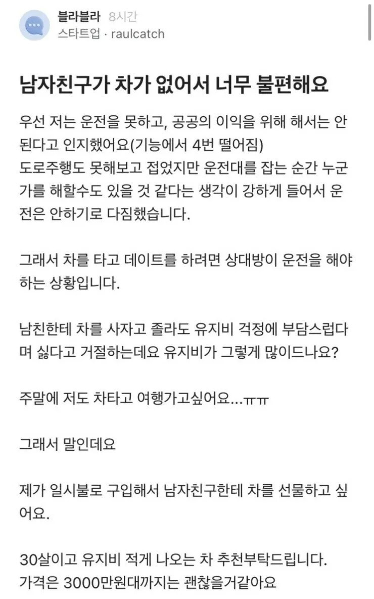 도탁스 (DOTAX) 남친이 차가 없어서 너무 불편해요 작성시간26.01.02|조회수11,670 목록 댓글 8 글자크기 작게가 글자크기 크게가 다음검색 현재 게시글 추가 기능 열기 북마크 공유하기 신고 센터로 신고 댓글 8 댓글 리스트 작성시간 26.01.02 누나 작성시간 26.01.02 ㅘ 미쳤다;;; 작성시간 26.01.02 와 작성시간 26.01.03 와......... 작성시간 26.01.03 거... 여친한테 잘해라 새끼야 카페 방문해 더 많은 댓글 만나기!