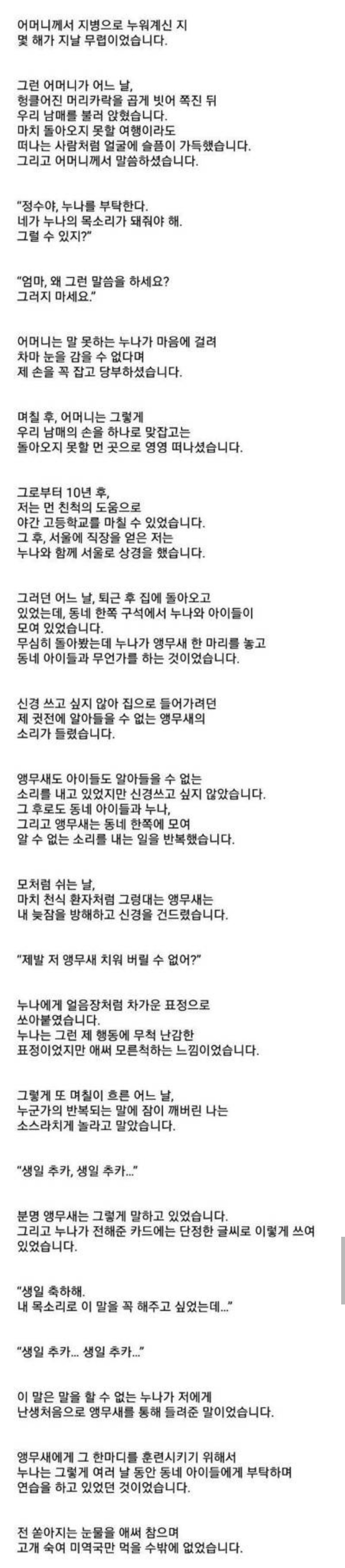 청각 장애인 누나의 생일상 작성자멜론크림빵|작성시간26.01.03|조회수15,360 목록 댓글 3 글자크기 작게가 글자크기 크게가 다음검색 현재 게시글 추가 기능 열기 북마크 공유하기 신고 센터로 신고 댓글 댓글 3 댓글쓰기 답글쓰기 댓글 리스트 작성자행복한날 | 작성시간 26.01.03 ㅠ 작성자금욕중 | 작성시간 26.01.03 ㅠㅠ 요즘 눈물이 많다 작성자SevenEleven | 작성시간 26.01.03 옛날 연탄길이었나 책 중에 이런 이야기 모음집이 많았는데그 중이 한 에피소드를 읽은 느낌이네 댓글 전체보기