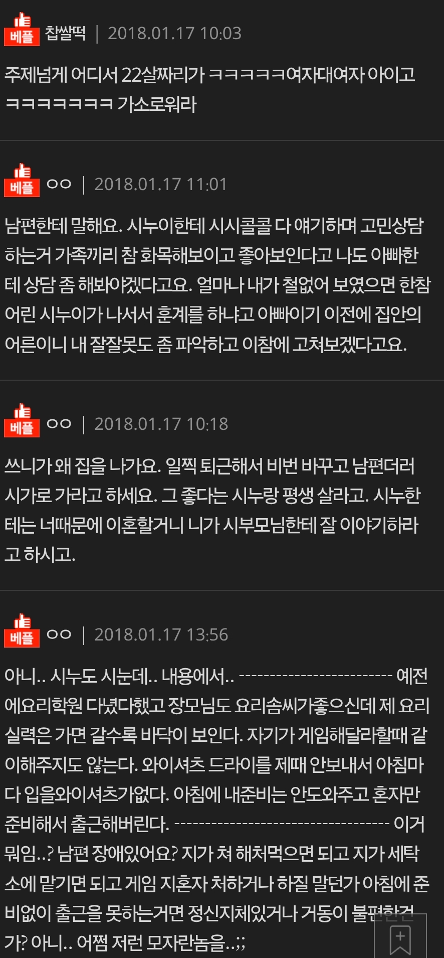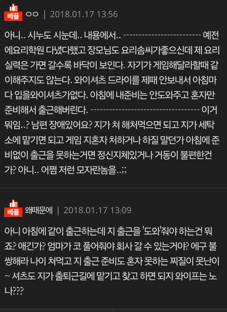 시누이가 저한테 한소리 해야겠다네요 작성자민정수석비서관|작성시간26.01.03|조회수4,979 목록 댓글 12 글자크기 작게가 글자크기 크게가 다음검색 현재 게시글 추가 기능 열기 북마크 공유하기 신고 센터로 신고 댓글 댓글 12 댓글쓰기 답글쓰기 댓글 리스트 작성자Allonets | 작성시간 26.01.03 맞벌이가 무슨 아따맘마 시절 내조를 바라고 22살 애새끼가 가르치려 들고 지랄났네 진짜 ㅋㅋㅋ 작성자SAKURA | 작성시간 26.01.03 그 오빠에 그 동생이네 ㅋㅋㅋㅋㅋㅋ 작성자Taupe | 작성시간 26.01.03 ㅋㅋㅋㅌㅋㅋㅋㅋㅋ 작성자대인배 | 작성시간 26.01.03 저런 병신미는 연애하면서 느꼈을텐데 작성자블랙데이 | 작성시간 26.01.03 어케 저런반푼이도 결혼을 하네 댓글 전체보기