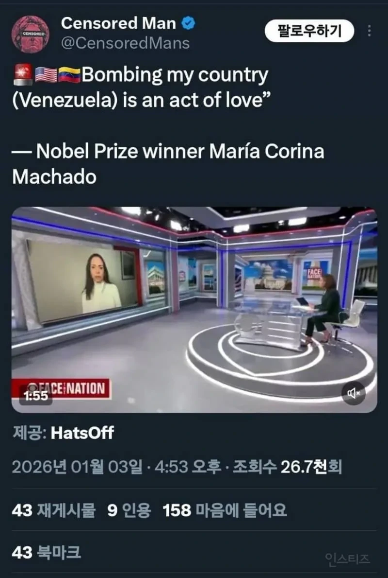 노벨평화상 수상자 "베네수엘라 폭격은 사랑행위" 작성자헤이즈 heize|작성시간26.01.03|조회수23,007 목록 댓글 4 글자크기 작게가 글자크기 크게가 베네수엘라 출신 코리나 마차도(2025 노벨평화상 수상자) 다음검색 현재 게시글 추가 기능 열기 북마크 공유하기 신고 센터로 신고 댓글 댓글 4 댓글쓰기 답글쓰기 댓글 리스트 작성자흰표범 | 작성시간 26.01.03 노벨평화상 받아놓고 폭격 옹호하는 거 뭔가 뭔가임 작성자오빠이럴려고나랑 | 작성시간 26.01.03 사랑하실분 작성자오태식이 돌아왔구나 | 작성시간 26.01.03 찌라시인지 모르지만 석유 이권 야권이랑 쇼브봤다던데 저기석유는국유화고 국민정서도 국유화라 민영화쉽지않다고 작성자먀몸미 | 작성시간 26.01.04 국민 입장에서는 광복된건데 당연히 섹스지 댓글 전체보기
