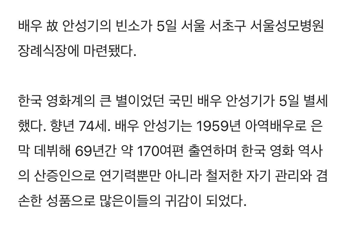 국민배우 故 안성기의 빈소 작성자대지뇨속|작성시간26.01.05|조회수29,452 목록 댓글 16 글자크기 작게가 글자크기 크게가 https://naver.me/xhl3e63q 다음검색 현재 게시글 추가 기능 열기 북마크 공유하기 신고 센터로 신고 댓글 댓글 16 댓글쓰기 답글쓰기 댓글 리스트 작성자죠르디야 제발 죠르지마 | 작성시간 26.01.05 삼가 고인의 명복을 빕니다. 작성자먀몸미 | 작성시간 26.01.05 삼가 고인의 명복을 빕니다 작성자Taupe | 작성시간 26.01.05 편안하시길 작성자제이데커 | 작성시간 26.01.06 삼가 고인의 명복을 빕니다. 작성자광주동네이장 | 작성시간 26.01.06 암이라는게 진짜 힘듬 ㅠㅠ 울엄니도 대장암으로 61세에 돌아가셨음넘 보고싶음 ㅠㅠ 댓글 전체보기