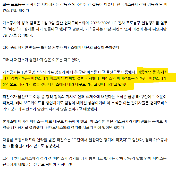 [KBL]고속도로 휴게소에서 버려진 닉 퍼킨스 작성자Melo|작성시간26.01.05|조회수3,951 목록 댓글 8 글자크기 작게가 글자크기 크게가 https://m.blog.naver.com/stopwook15/224135354193 가스공사 구단 입장도 들어봐야겠지만.. 사실이라면 일처리 레전드 ㅋㅋㅋ 다음검색 현재 게시글 추가 기능 열기 북마크 공유하기 신고 센터로 신고 댓글 댓글 8 댓글쓰기 답글쓰기 댓글 리스트 답댓글 작성자Melo 작성자 본인 여부 작성자 | 작성시간 26.01.06 키움히어로즈 구단 입장문 보니까 기자가 조회수 어그로 끈 것 같네요 ㅋㅋ기사 제목도 버린 --> 내린으로 수정 이미지 확대 작성자연중무휴 | 작성시간 26.01.05 ? 진짜면 너무한데... 작성자NIKEMAN | 작성시간 26.01.05 ㄱㄷ 작성자scratch | 작성시간 26.01.05 아무리 그래도 고속도로에 드랍해서 알아서 가라는건 너무 가혹하지 않나? 작성자Melo 작성자 본인 여부 작성자 | 작성시간 26.01.06 이미지 확대 댓글 전체보기