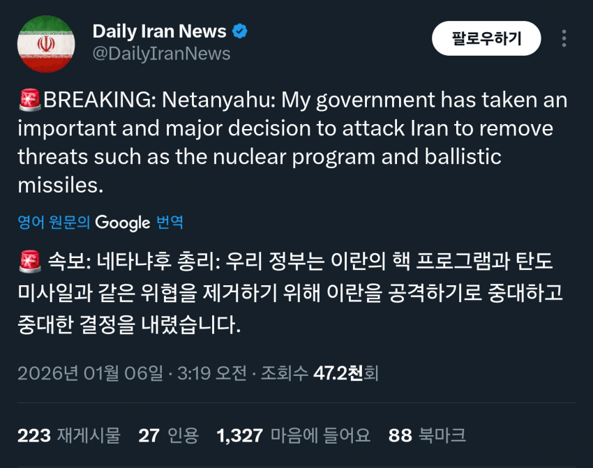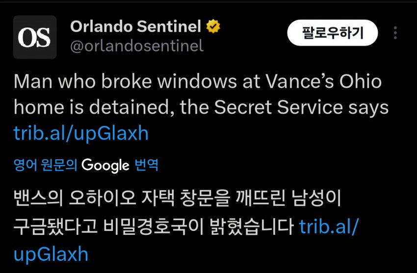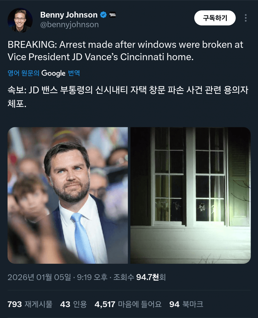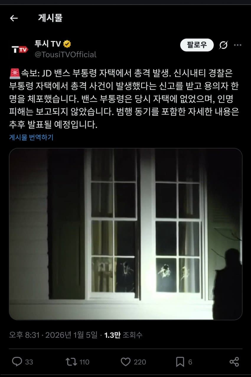 미국 밴스 부통령 자택에서 향해 총격사건 발생 작성자내꿈은롯데우승보ㄱI|작성시간26.01.06|조회수7,020 목록 댓글 2 글자크기 작게가 글자크기 크게가 부통령은 당시 집에 없었음 다음검색 현재 게시글 추가 기능 열기 북마크 공유하기 신고 센터로 신고 댓글 댓글 2 댓글쓰기 답글쓰기 댓글 리스트 작성자진지드세요 | 작성시간 26.01.06 ㅈ되려고 하는데가 많네 작성자AV 레전드 | 작성시간 26.01.06 자택에서 향해? 댓글 전체보기