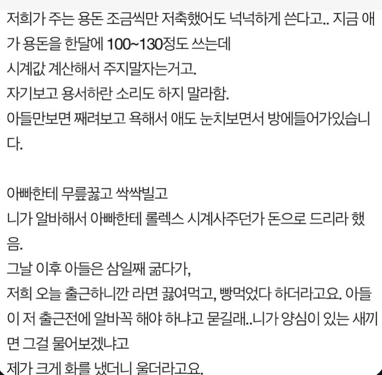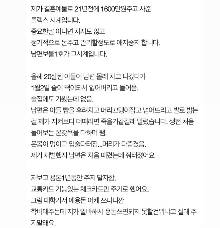 중요한 날에만 차는데 주기적으로 관리를 했다는거 보면 진짜 소중한 물건일텐데 세상이 무너졌는데 무너트린게 자식이라 당장은 더 화날듯... -