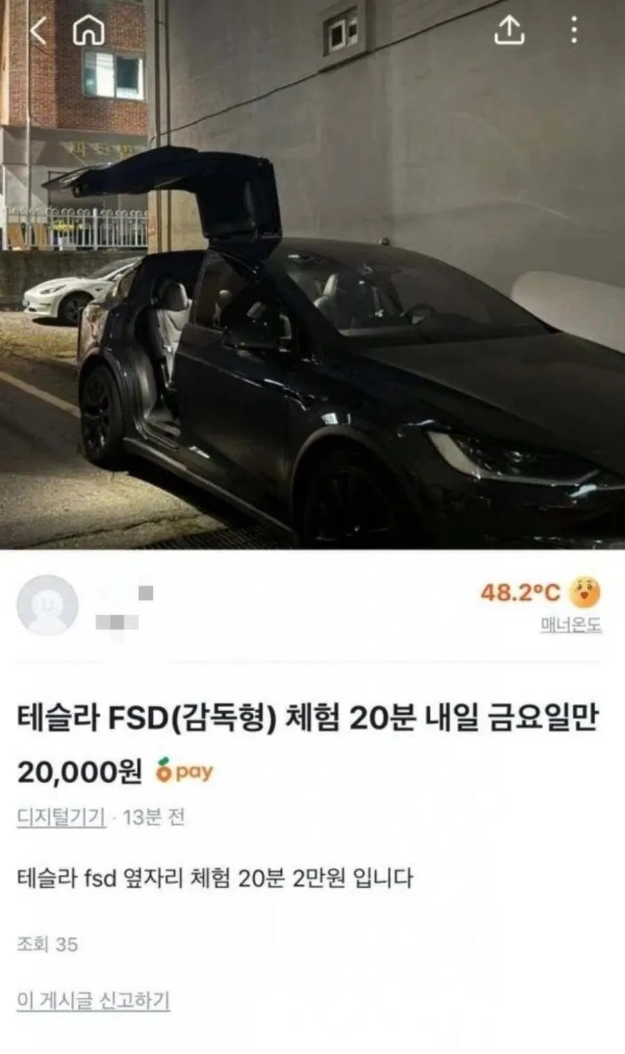 당근에 올라온 테슬라 FSD 체험 가격 작성자헤이즈 heize|작성시간26.01.07|조회수21,586 목록 댓글 13 글자크기 작게가 글자크기 크게가 다음검색 현재 게시글 추가 기능 열기 북마크 공유하기 신고 센터로 신고 댓글 댓글 13 댓글쓰기 답글쓰기 댓글 리스트 작성자Alika | 작성시간 26.01.07 불법만아니면 예비구매자 입장에서는 좋은듯 실사용자한테 질문하고 답변들을수도 있고 판매하는 사람이 아니니 더 정확히 답변해줄듯? 작성자쭉쭉쭉가나바 | 작성시간 26.01.07 ㄹㅇ 할만하네 작성자헬스짱짱 | 작성시간 26.01.07 ㅈㄴ 궁금하긴 함 작성자심술가득독만두 | 작성시간 26.01.07 놀이기구냐 ㅋㅋㅋㅋㅋㅋㅋ 작성자CLiMax | 작성시간 26.01.07 존나 궁금하긴함ㅋㅋㅋ 댓글 전체보기