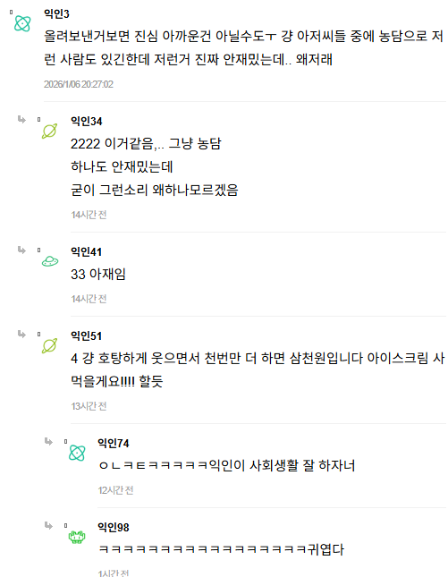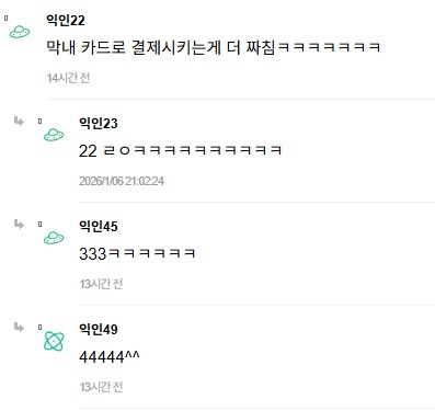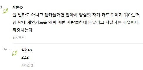 작성자하피 작성시간 26.01.07 연말정산 개꿀이고 카드실적채우기도 개꿀임. 귀찮아하는 사람이나 카드결제 시킨다고 욕하지 좀만 이득되는거 생각하면 결제시켜주는거 고마워해야됨 ㅋㅋㅋ 그리고 차장은 아재장난치는거 같은데...멘트가 좀 그렇네