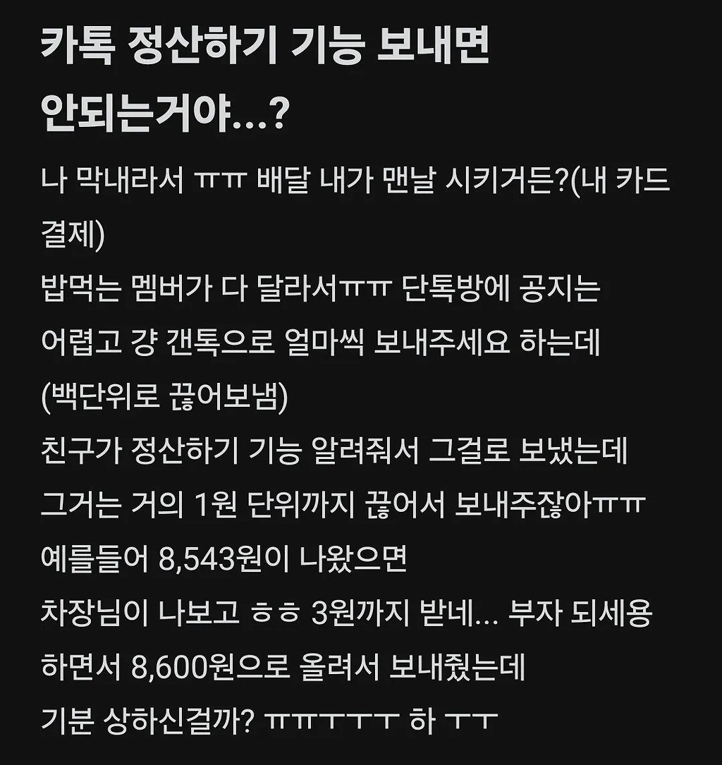 작성자훈훈한 도탁스 작성시간 26.01.07 막내카드로 긁으면 돈을 먹기전에 줘야댐 어설프게 늦어지면 까먹고 받을사람이 불편함