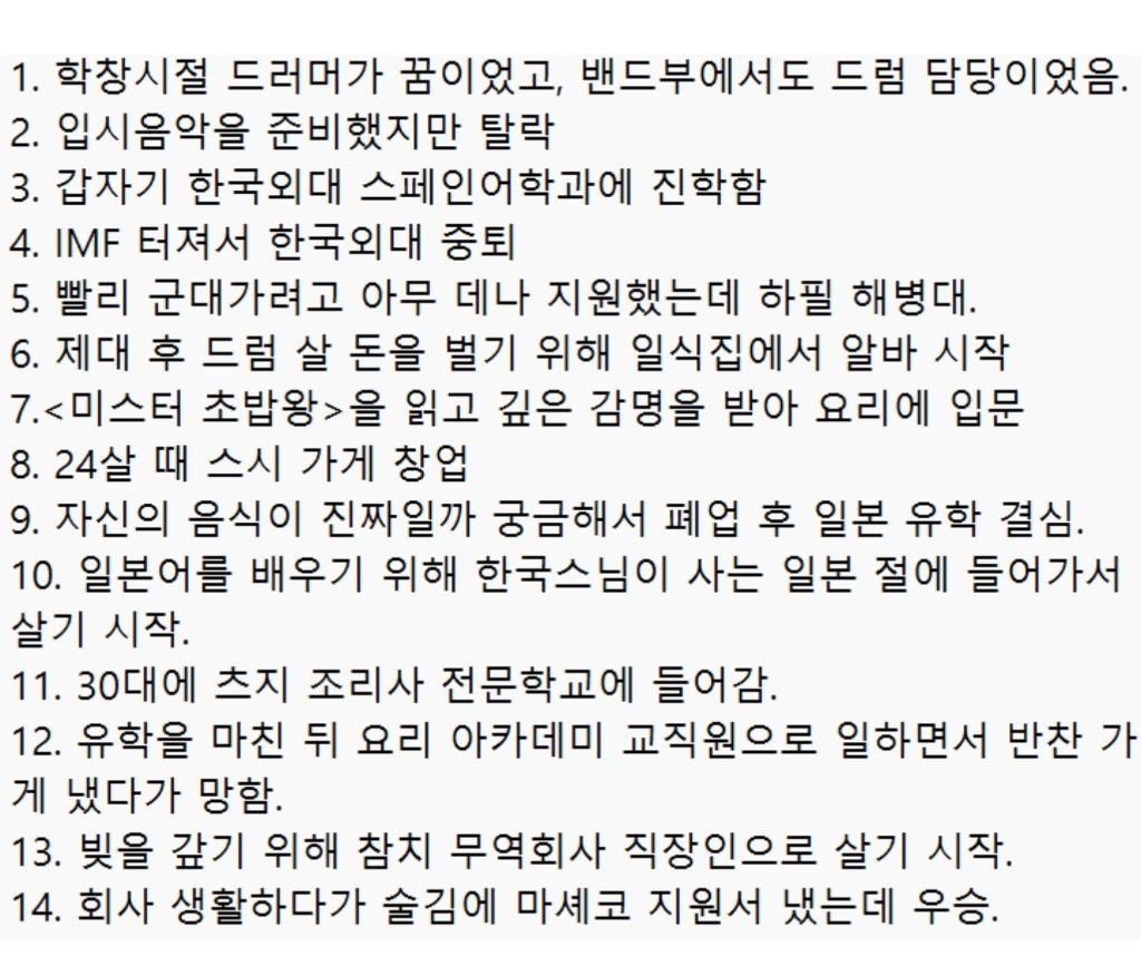 도대체 눈치 안봤으면 어느정도 노빠꾸 인생을 살았을지 감도 안오는 인물 작성자임짱TV|작성시간26.01.07|조회수14,733 목록 댓글 16 글자크기 작게가 글자크기 크게가 +흑요 1후 웨이팅 1위였는데 가게 접음진심 웹툰이나 영화 주인공급 다채롭고 치열함 ㄷㄷ 다음검색 현재 게시글 추가 기능 열기 북마크 공유하기 신고 센터로 신고 댓글 댓글 16 댓글쓰기 답글쓰기 댓글 리스트 작성자Saffran | 작성시간 26.01.07 씹상남자네...30대 조리학교 ㅋㅋㅋㅋ 작성자웃게주게야게 | 작성시간 26.01.07 이야.. 작성자PeNt | 작성시간 26.01.07 눈치 안볼래 재미있게 놀래 작성자미르별 | 작성시간 26.01.07 행동력이 진짜 대단하네 ㄷㄷ 작성자시즌오프 | 작성시간 26.01.07 저 행보가 눈치본거면 눈치안보는건 대체 어떤거얔ㅋㅋ 댓글 전체보기